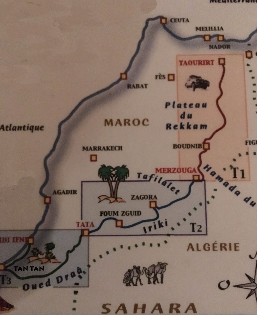 En ce qui concerne l’itinéraire, nous filerons direct sur Alméria en Espagne afin de prendre le bateau pour Nador . Là, le raid proprement dit commencera à Nador pour terminer à Sidi Ifni près de TanTan au Sud Ouest du Maroc. Si les conditions de pistes nous prennent trop de temps, nous couperons une partie du parcours et donc l’etape de Sidi Ifni sera supprime.