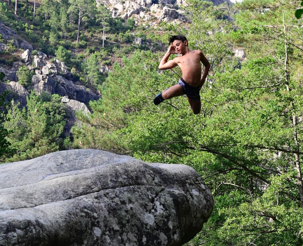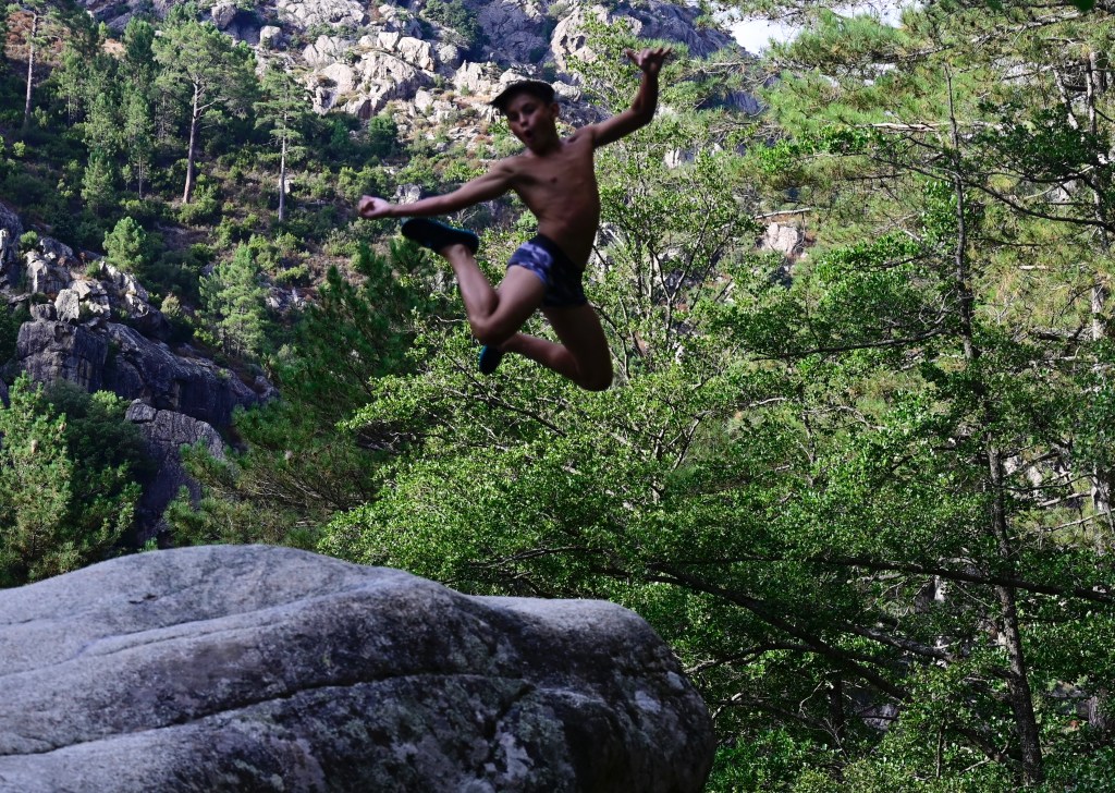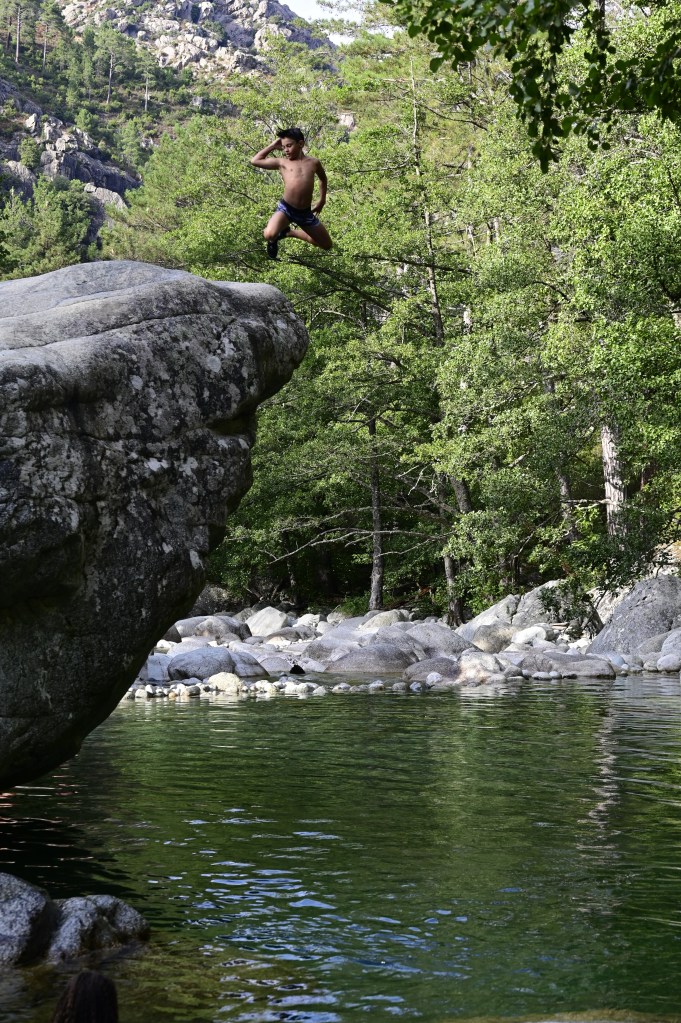 Nous avons ensuite repris la route vers Corte, un bien jolie ville citadelle juchée au sommet d’un piton rocheux. C’est une étape incontournable tellement l’identité Corse est présente avec bien des combats d’émancipation. C’est un haut lieu de la mémoire CORSE . C’est aussi le départ de randonnées de montagnes dans la vallée de la Restonica , un joyau de nature . C’est aussi là que les enfants s’en sont donné à cœur joies dans les magnifiques piscines naturelles avec des sauts de plus de six mètres dans le torrent . Nous dormons dans la vallée ce soir et demain lever tôt pour une belle rando vers le lac de Melo. Cette fois là, ce sera l’équipage qui sera mis à l’épreuve , nous verrons si tout le monde tiendra ! !