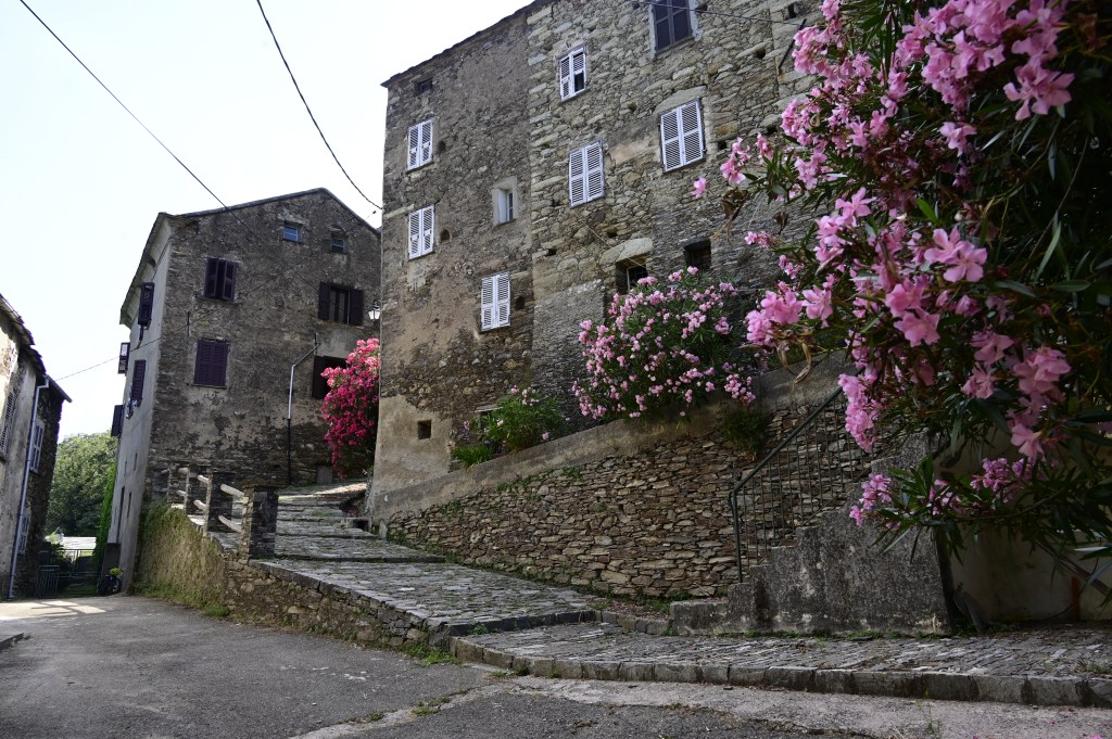 Nous voilà plongé aujourd’hui dans le cœur de la Corse avec son âme et son histoire . Dans cette région qu’est la Castaniccia, on ressent l’authentique loin du « bling bling » parfois des stations balnéaires de la côte. Il règne un calme particulier dans ce paysage de petits villages plein de charme accrochés dans ce poumon vert de l’île . Mais on ressent aussi que ces endroits se sont vidés petit à petit de leurs habitants, ceux ci descendant vers la plaine . Cette région au final peu touristique est un véritable plaisir à découvrir.