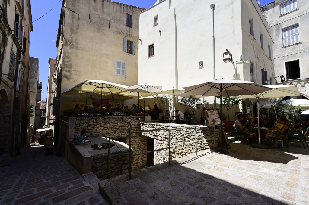 Pour admirer les fortifications et jouer aux sentinelles d’antan, Nous avons emprunté une partie du chemin de ronde qui offre un spectacle saisissant sur la baie des bouches de Bonifacio. Autre source d’émerveillement : les maisons. Elles dominent à 60 mètres de haut à flanc de falaises. Mieux vaut ne pas avoir le vertige pour ouvrir ses fenêtres mais il y avait ainsi peu de risques qu’elles soient prises d’assaut ! En se promenant dans les ruelles étroites, En levant la tête on observe de drôles de gouttières. En fait elles servaient à faire passer l’eau potable des citernes de maison en maison … ingénieux !