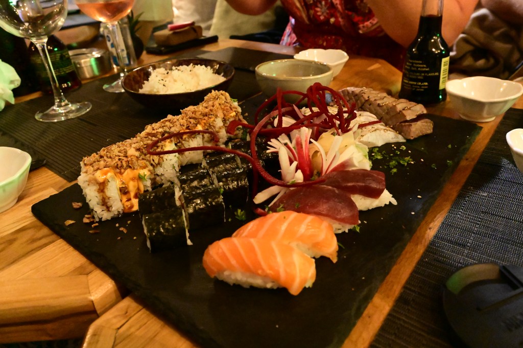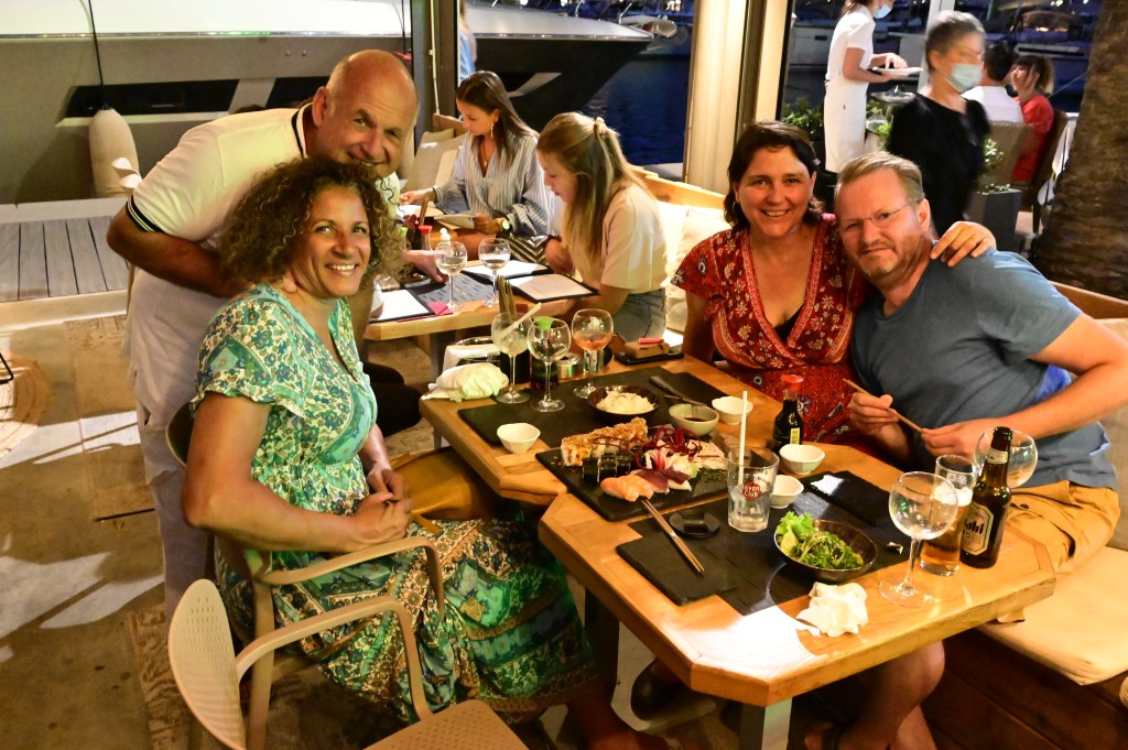 En attendant, ce soir nous avons fêter l’anniversaire de Pierre en dégustant des sushis ( merci David et Gemma) sur le port en compagnie des yachts assez étonnants et grandioses qui longent les quais . Les enfants eux se sont fait leur propre restau dans une crêperie un peu plus loin. Une façon bien agréable de finir cette journée « anniversaire » . Demain nous partons pour la montagne dans les aiguilles de Bavella. Le vent s’est calmé et nous pourrons prendre la route pour une activité canyoning.
