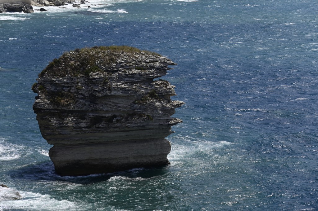 Mais visiter le site, c’est aussi regarder au large où de suite le « grain de sable » prends une dimension pittoresque et c’est LA photo à faire à Bonifacio. La roche est isolée au beau milieu de l’eau. Seuls les oiseaux marins peuvent s’y percher pour prendre le soleil et repérer les poissons . Cette gigantesque roche est le symbole de la force des éléments naturels qui frappent les côtes Bonifaciennes. Le « Diu Grossu ») doit son nom à sa forme, plutôt qu’à sa taille ! En fait sa masse calcaire s’est détachée de la falaise toute proche à cause de l’érosion.