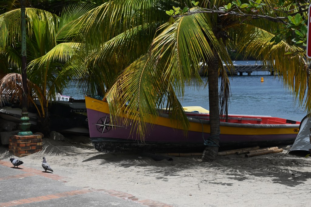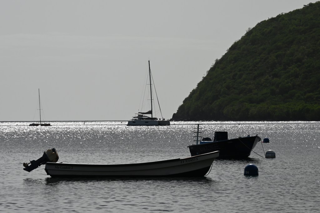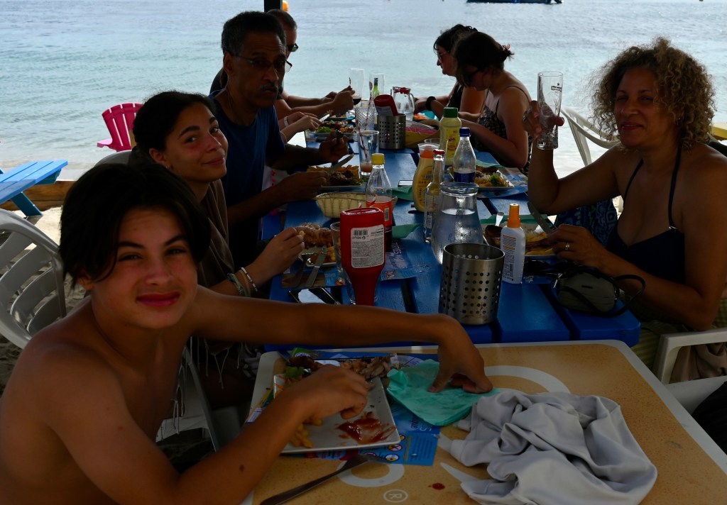 Après un bon petit dej, mode créole nous sommes partis à Grande Anse une bien jolie plage située au Sud de l’île . Le Hic quand même ce sont les bouchons, une seule route principale dessert le tour de la Martinique . Elle est entrecoupée par de nombreux ronds points ce qui ne facilite pas vraiment la circulation ! Mais le bouchon vaut bien le détour et la carte postale digne de la beauté des Antilles ! L’eau chaude promise est bien là et les tracas du matin, oubliés ! Au retour à la maison, nous sommes passés par l’ance d’Arlet et la pointe du bout un petit village créole typique avec une marina ! Pour une première journée, et pour une première découverte pour les garçons, nous sommes bien dans l’ambiance Antillaise … c’est top !