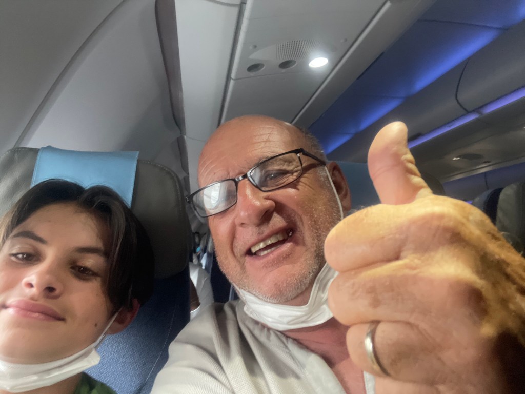 La préparation de la maison à Arès pour la location est toujours épique ! Tout dans le garage , la Mini est à l’étroit !Départ de Bègles de chez Martine et Henri Orly … à l’embarquement !Un avion Corsair pour notre voyage, flambant neuf ! Attention au décollage !Nous voilà en l’air … tout s’est bien passé ! Père et fils dans un avion ! La mer de nuage, c’est toujours magique ! Des vagues de nuages… un joli spectacle ! Jolie île, te voilà !Les premiers bateaux… Pierre attends avec impatience de naviguer ! Atterissage en douceur !Le pilote était au top ! Mais les formalités et la récupération des valises c’est « beurk « ! Les premiers cocotiersL’arbre du voyageur dès la sortie de l’aéroport …Mais surtout un comité d’accueil qui nous attends … Dis ma chérie, tu m’as manqué !!! Momo, ton sourire est toujours aussi beau … merci aussi à toi Alick !La famille est déjà très accueillante, la suite arrivera ces prochains jours ! Il nous tarde … !