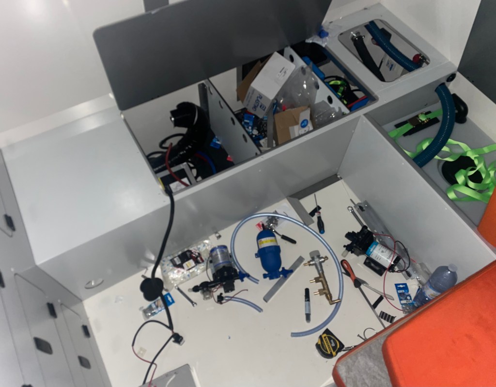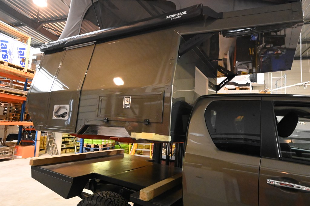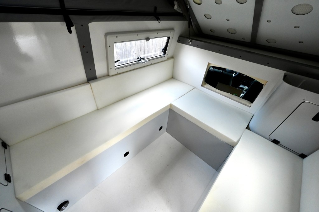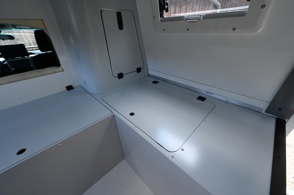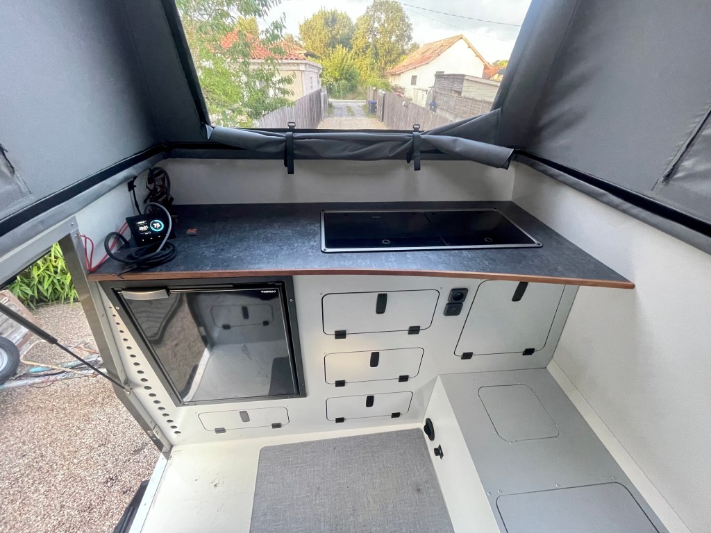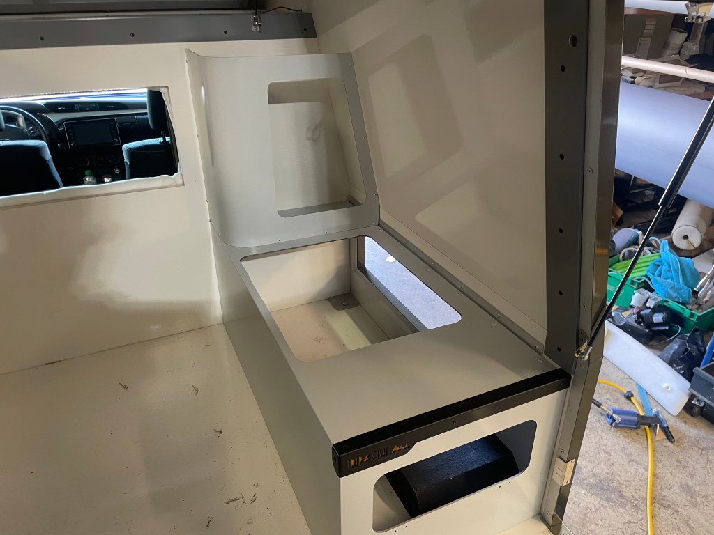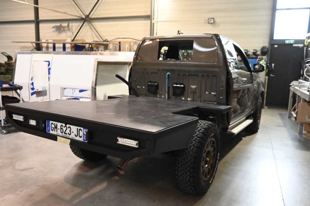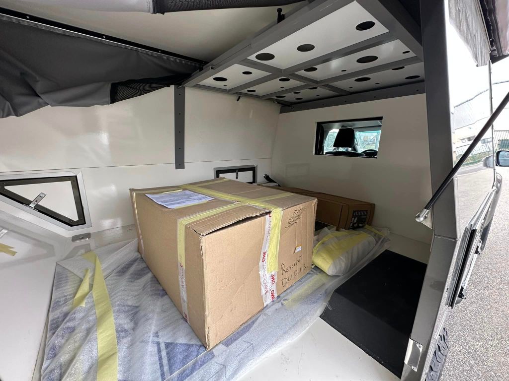 La rencontre s’est faite avec Julien, le concepteur des cellules Trip & Fish et là, déclic ! Une caisse bien profilé , pas très imposante, peinte à la couleur du véhicule faisant un ensemble harmonieux et pratique. On a adoré ! Restait à convaincre le constructeur de nous faire une cellule vide, financièrement c’était mieux pour nous et puis de toute manière, on voulait des choses différentes que celle proposées pour un engin qui sort des sentiers battus !