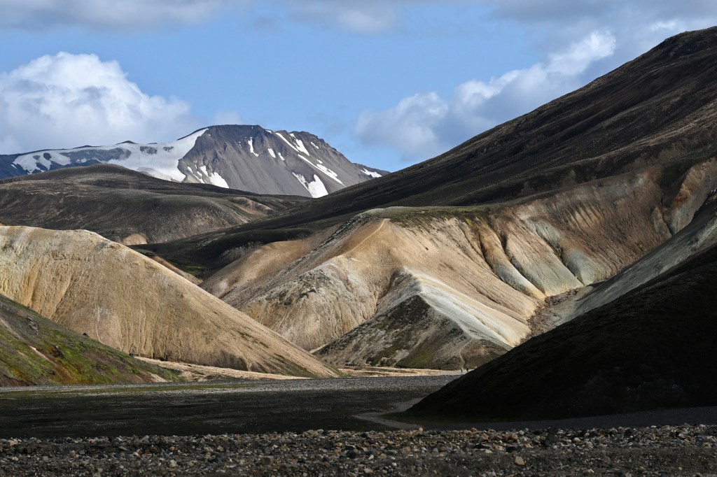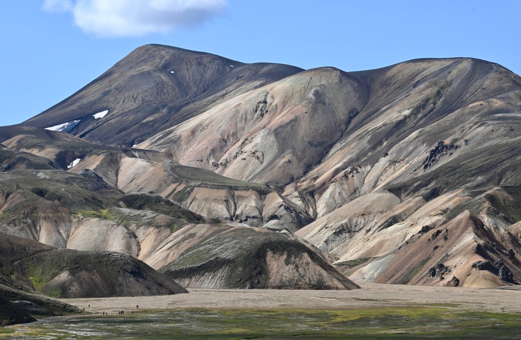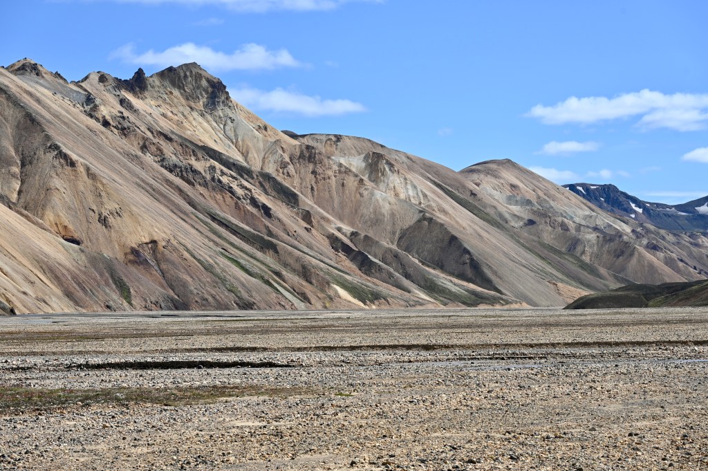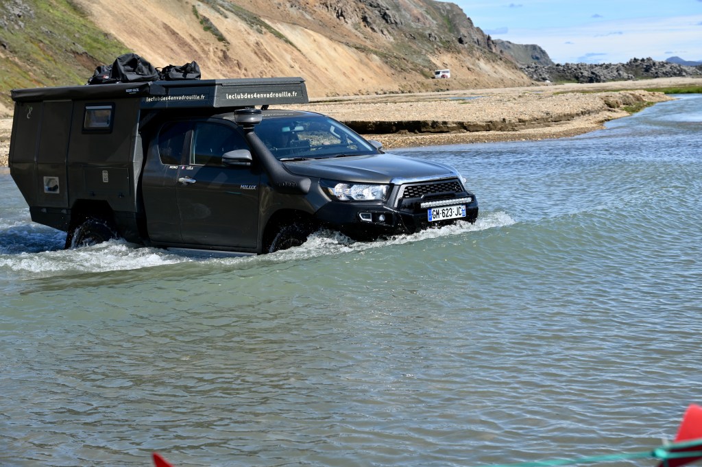 L’arrivée au Landmannalaugar se fait par 2 gués d’un l’un est assez profond, il y des fois même des véhicules qui restent plantés dedans . Le décor est sans appel, superbe même si très fréquenté ! Même si de « super bus « haut perchés lâchent des touristes, il y a par contraste beaucoup d’aventuriers qui viennent ici par leurs propres moyens. Cela ressemble un peu à un camp de base pour randonneurs aguerris et cette ambiance est plutôt agréable.