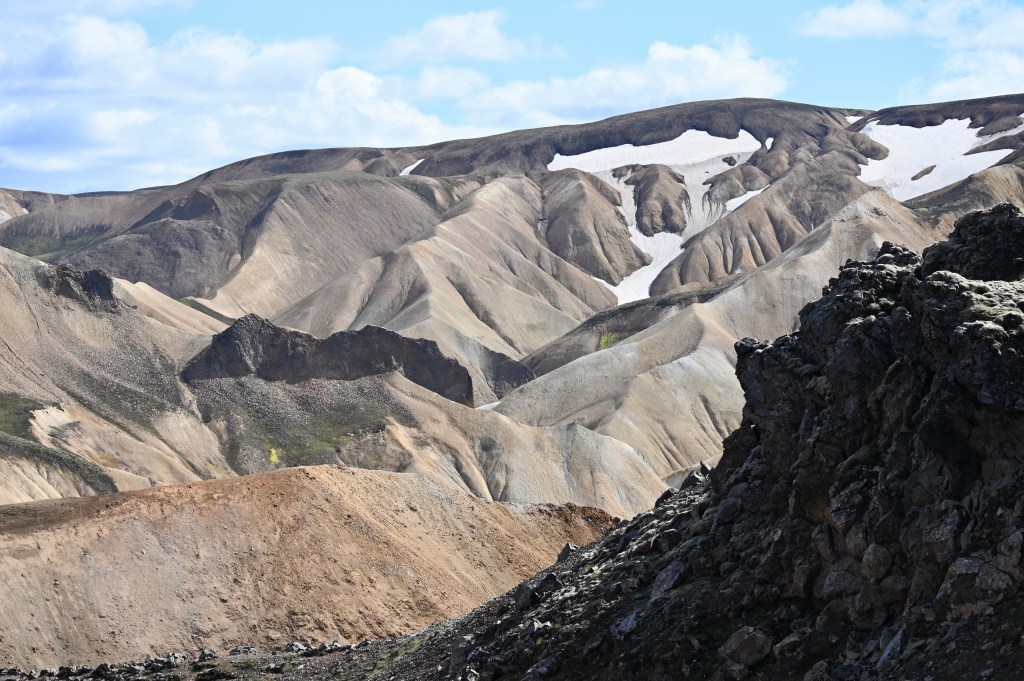 Nous avons effectué la plus petite rando proposé parmi les nombreux itinéraires proposés dont le fameux trek Laugavegur classé comme parmi les plus belles randos du monde ! Bon, c’est 4 jours de marche intense , nous nous sommes contenté pour notre par que d’une demi-journée ! Au départ, nous étions un peu déçu du parcours, mais il faut savoir prendre de la hauteur pour se rendre compte du décor assez exceptionnel. Les ravins striés rappellent ceux de la vallée de la mort aux États Unis et offrent une palette de couleur allant du caramel, de l’ocre, du noir, du gris, du bleu, de l’orange … comme si un peintre fou avait lâché son pinceau et que les teintes s’étaient délavées ! Un art étonnant et assez unique !