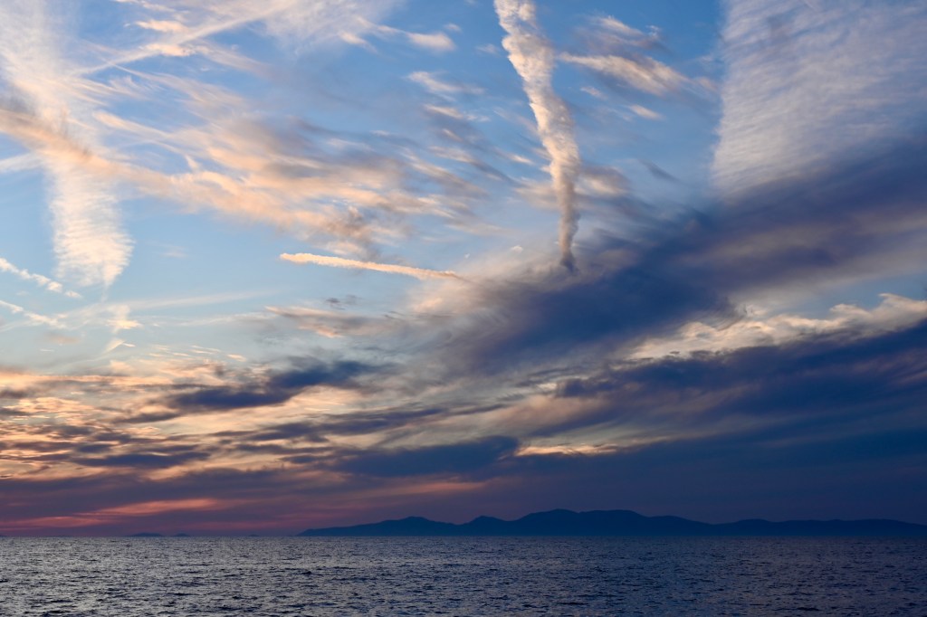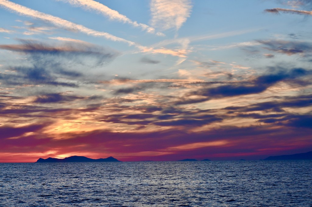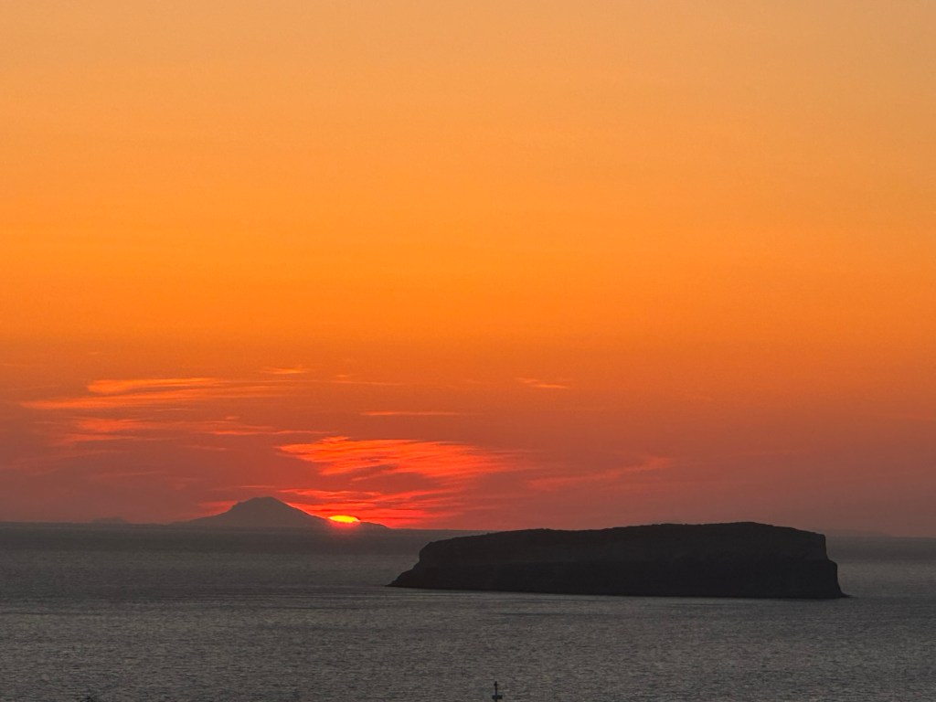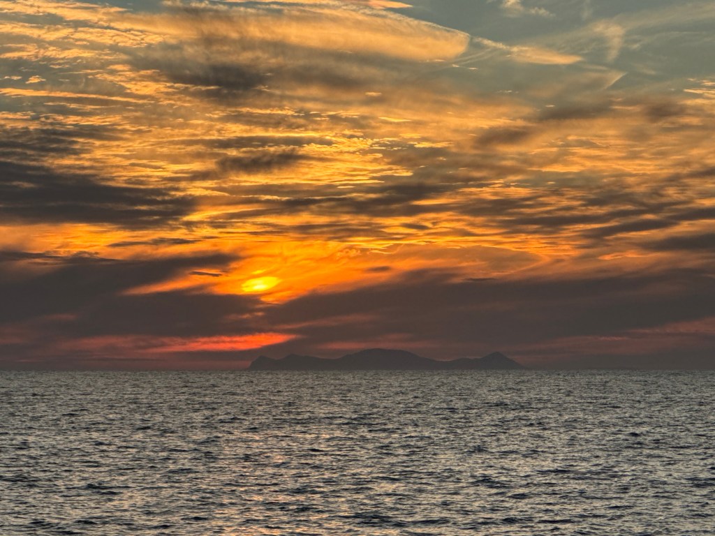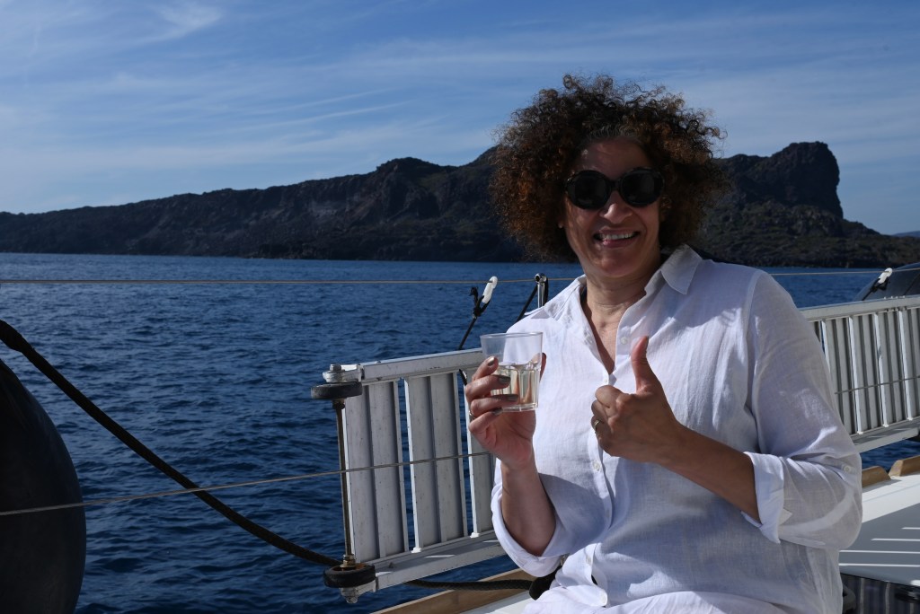 Maison à vendre surplombant la mer ! Une belle affaire seule la structure est terminée, donc encore inhabitable ! Sur l’île Néa Kaméni, les fumerolles sous marine laisse une teinte orange sur la rive avec une odeur de souffre. Baignade possible dans les sources d’eaux chaudes possible … Nous n’avons pas tenté , il faut une eau encore plus chaude pour Leïla !!! Petite chapelle de l’île … toute blanche bien évidement ! Madame en mode farniente ! C’est top de profiter sans se poser de question !!!On déguste un petit coup de blanc avant le repas à bord qui était excellent … Petite chapelle enclavée dans les roches , seulement accessible par bateau . Leïla , tu attends le coucher du soleil 🌞? Attends, j’arrive même si tu es un soleil à toi toute seule ! Romantisme te voilà !… 😢Ben, justement Monsieur se couche … Couleurs splendides, nous n’aurions pas pu rêver mieux !Les couchers de soleil à Santorin ne sont pas une légende !Le petit plus avec un ciel de traîne digne d’une œuvre d’art !Mais toutes les belles choses ont une fin, notre cata nous ramène à terre !Au port de Ioa… escale définitive !Cette belle journée se disperse dans le ciel… quel souvenir magnifique !