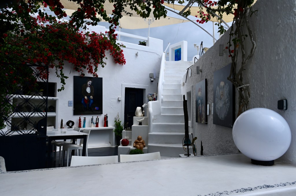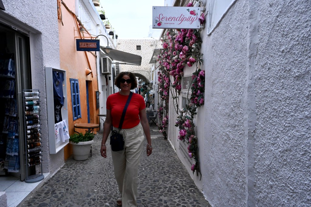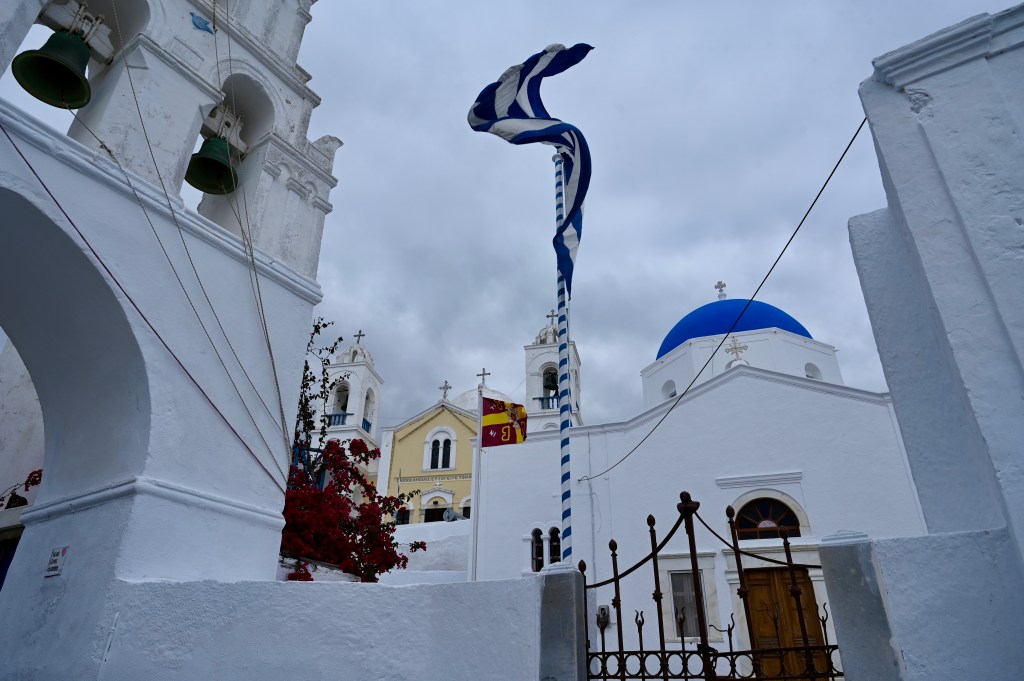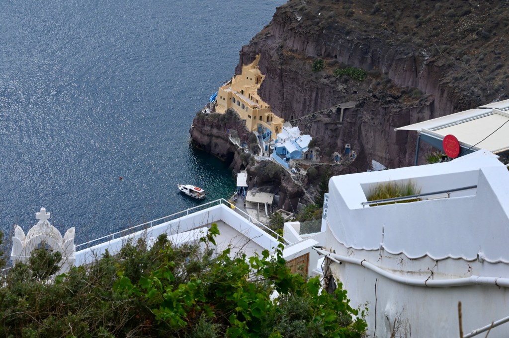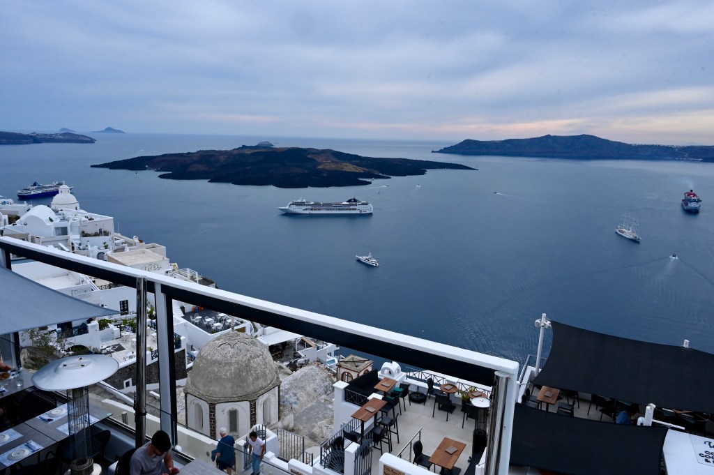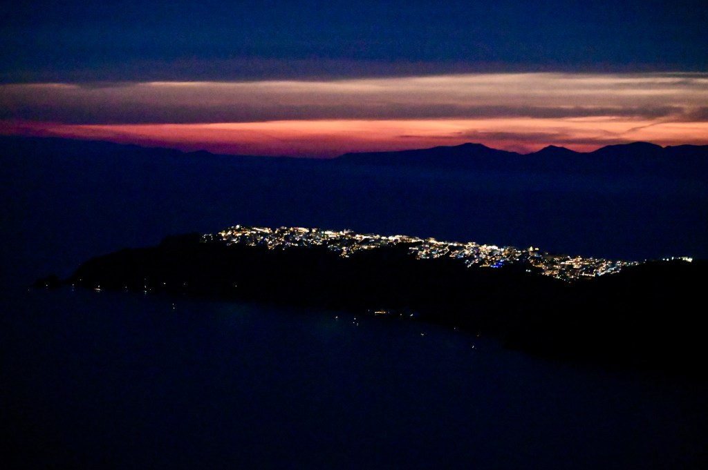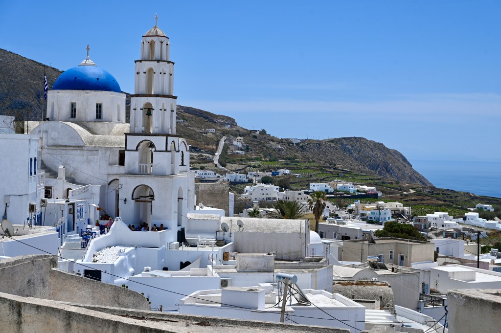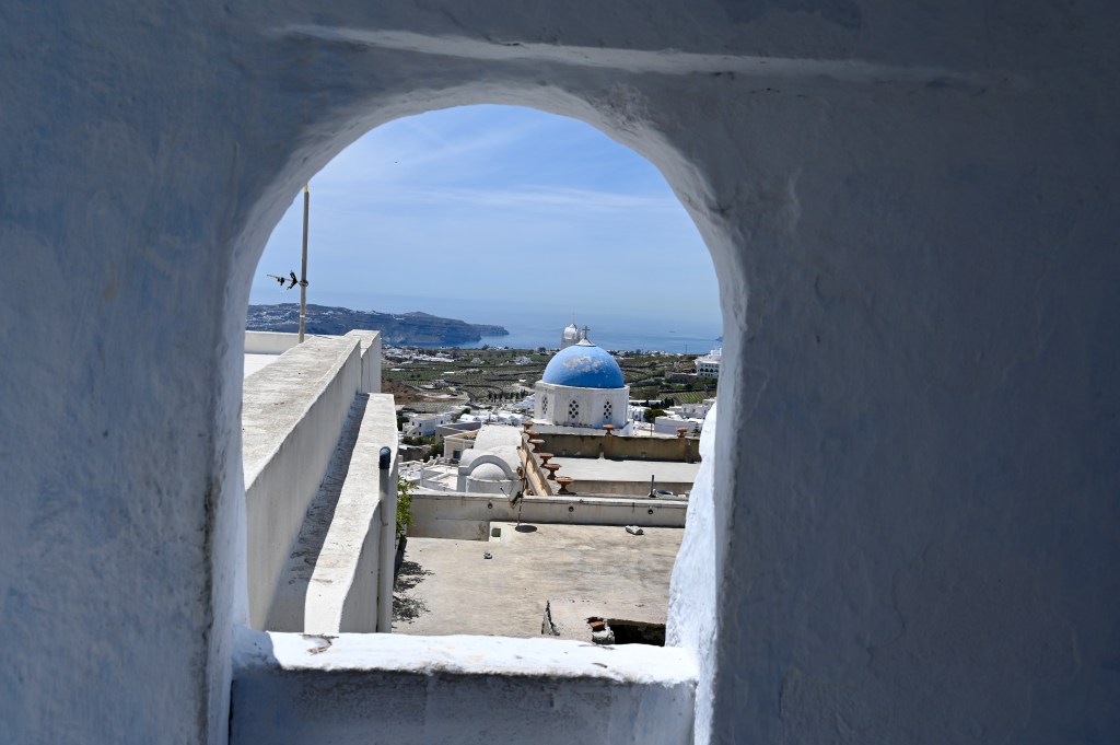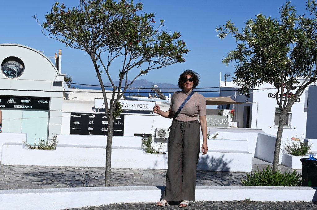 Le charmant village de Pyrgos, des ruelles blanches et des dômes d’église bleue … la marque architecturale de Santorin ! Un dédale de ruelles, on s’y perd facilement Avec vue sur la mer Egée bien sûr !Une fenêtre par ci par là … Et hop, un paysage urbain typique ! Au fait elle fait quoi la maison rouge ?!!!😳 Une porte par ci par là … Et hop, une Leïla qui danse sur une musique de Zorba le Grec, the Greek dance ! Le charme des églises … Et des clochers !Un tout blanc surplombe la mer ! Des petites surprises aussi dans le village ! Hôtel sympa, non … profiter c’es ça !Autre style, le site archéologique de Kamari Tout au bord de la mer … Oups, avec plage à touristes à côté … bizarre !Bon, le sable est noir , pas le même que le nôtre du cap Ferret !!! Vous avez dit volcan bien sûr 🙄 Mais le coin avec ses hautes falaises est très beau 😻 Petit port de pêche sur la côte Sud Est Les enfants préparent les filets … Qui sont prêts à embarquer !On change de programme, balade dans Fira la capitale ! Commerces et places en tout genre ! Vue d’en haut, ça sent le tourisme croisière haut de gamme… oui ça gâche le paysage, mais ça fait vivre l’île ! Joli débarcadère en bas de la capitale, on y monte et descend avec une remontée mécanique ! Autre endroit de charme, Imorovigli avec un village sur les hauteurs de l’île … Avec beaucoup de beaux hôtels, vue sur la caldeira et la mer Egée !Entrez s’il vous plaît !Votre chambre c’est laquelle ?!Euh, celle là avec solarium et piscine , merci !🙏 Les restos ne sont pas à la peine ! Ce soir, on a choisi celui là !Avec coucher de soleil bien entendu!🙄 Toujours aussi beau … 🤩 Après le repas on s’allonge pour profiter du spectacle … de vrais nababs !!!Le soleil s’éteint gentiment… les lumières de Oia s’allument ! Encore une magnifique journée !