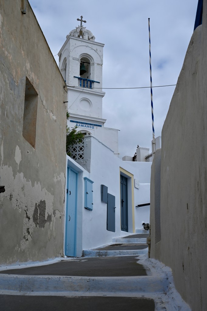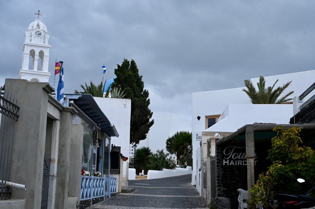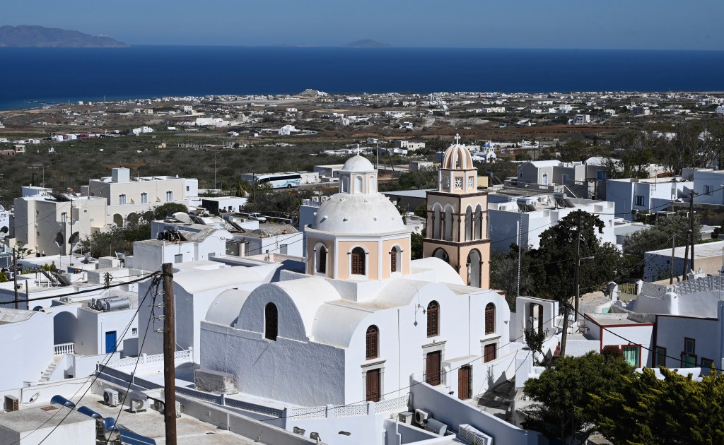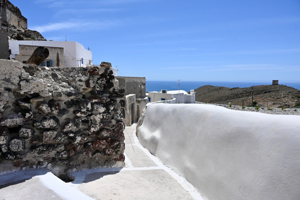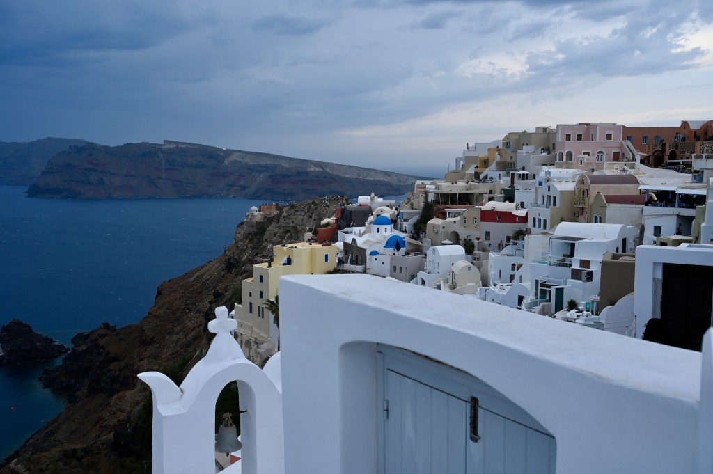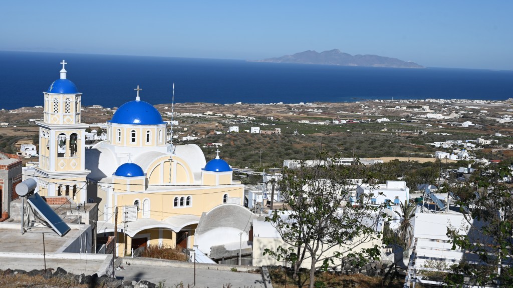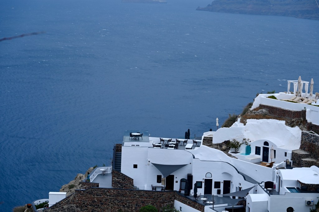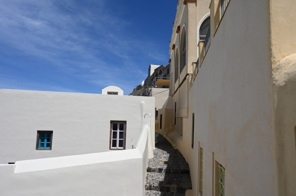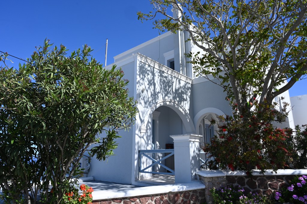 Le charmant village de Pyrgos, des ruelles blanches et des dômes d’église bleue … la marque architecturale de Santorin ! Un dédale de ruelles, on s’y perd facilement Avec vue sur la mer Egée bien sûr !Une fenêtre par ci par là … Et hop, un paysage urbain typique ! Au fait elle fait quoi la maison rouge ?!!!😳 Une porte par ci par là … Et hop, une Leïla qui danse sur une musique de Zorba le Grec, the Greek dance ! Le charme des églises … Et des clochers !Un tout blanc surplombe la mer ! Des petites surprises aussi dans le village ! Hôtel sympa, non … profiter c’es ça !Autre style, le site archéologique de Kamari Tout au bord de la mer … Oups, avec plage à touristes à côté … bizarre !Bon, le sable est noir , pas le même que le nôtre du cap Ferret !!! Vous avez dit volcan bien sûr 🙄 Mais le coin avec ses hautes falaises est très beau 😻 Petit port de pêche sur la côte Sud Est Les enfants préparent les filets … Qui sont prêts à embarquer !On change de programme, balade dans Fira la capitale ! Commerces et places en tout genre ! Vue d’en haut, ça sent le tourisme croisière haut de gamme… oui ça gâche le paysage, mais ça fait vivre l’île ! Joli débarcadère en bas de la capitale, on y monte et descend avec une remontée mécanique ! Autre endroit de charme, Imorovigli avec un village sur les hauteurs de l’île … Avec beaucoup de beaux hôtels, vue sur la caldeira et la mer Egée !Entrez s’il vous plaît !Votre chambre c’est laquelle ?!Euh, celle là avec solarium et piscine , merci !🙏 Les restos ne sont pas à la peine ! Ce soir, on a choisi celui là !Avec coucher de soleil bien entendu!🙄 Toujours aussi beau … 🤩 Après le repas on s’allonge pour profiter du spectacle … de vrais nababs !!!Le soleil s’éteint gentiment… les lumières de Oia s’allument ! Encore une magnifique journée !