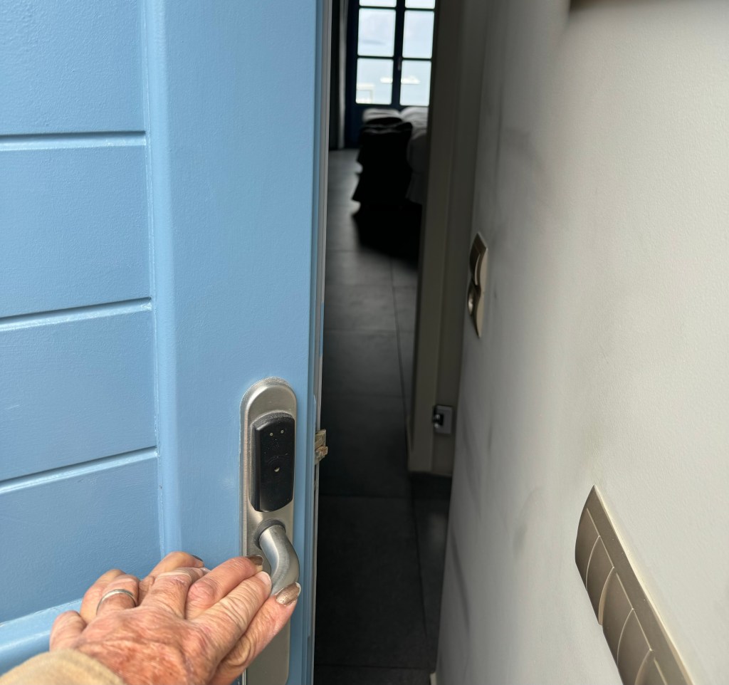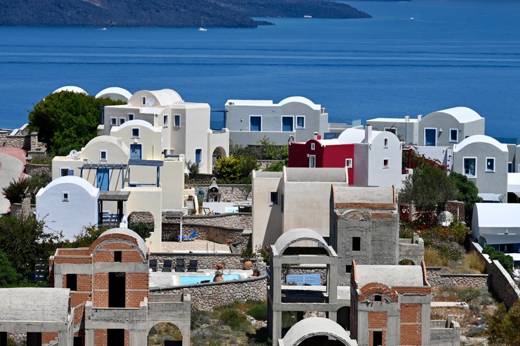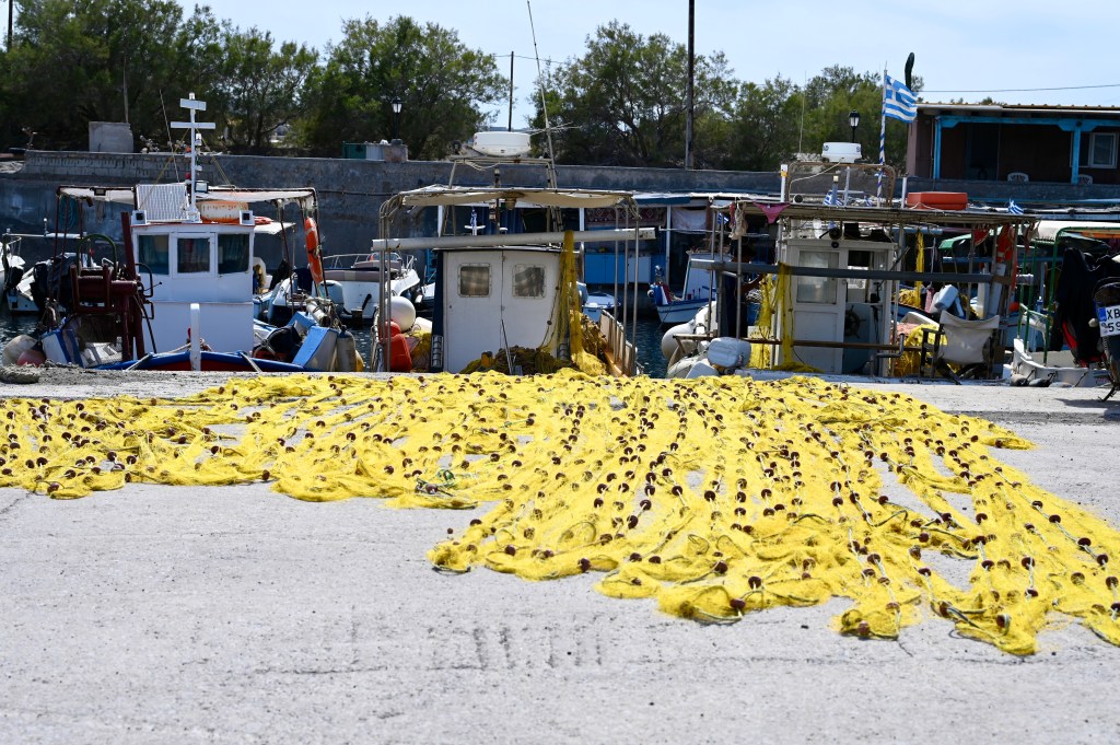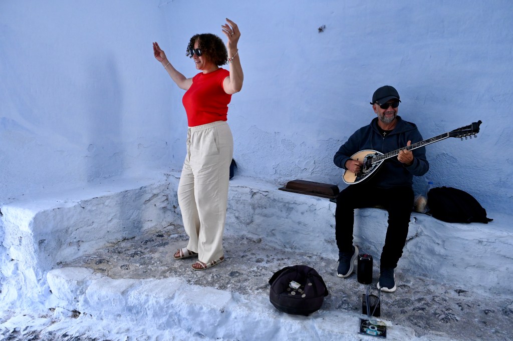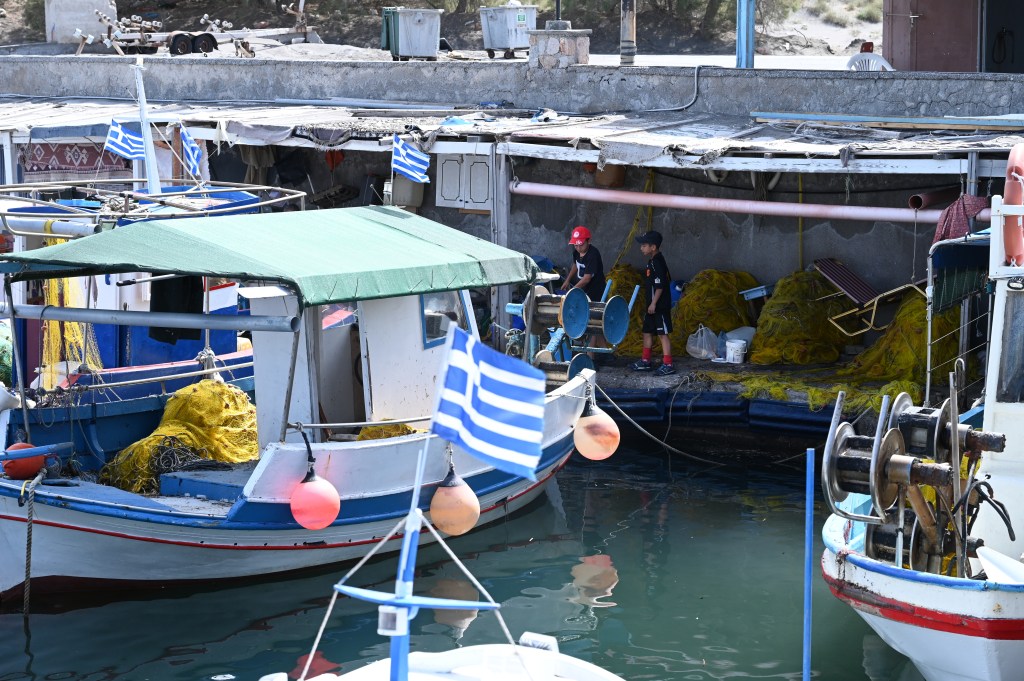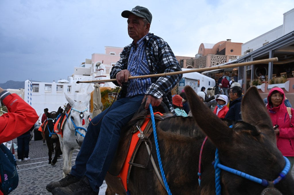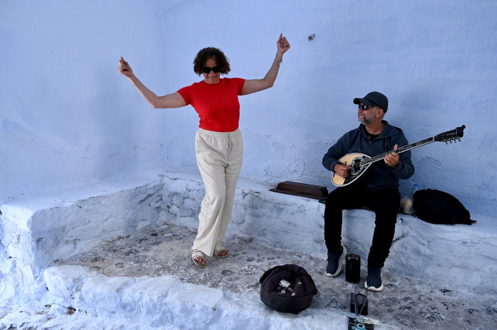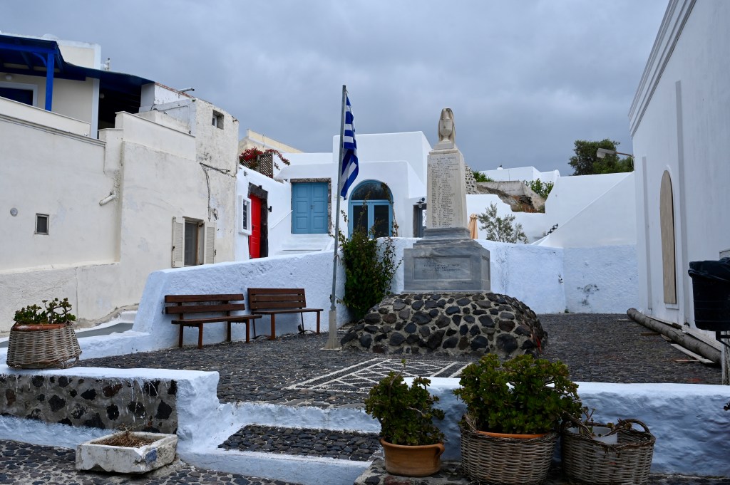 Le charmant village de Pyrgos, des ruelles blanches et des dômes d’église bleue … la marque architecturale de Santorin ! Un dédale de ruelles, on s’y perd facilement Avec vue sur la mer Egée bien sûr !Une fenêtre par ci par là … Et hop, un paysage urbain typique ! Au fait elle fait quoi la maison rouge ?!!!😳 Une porte par ci par là … Et hop, une Leïla qui danse sur une musique de Zorba le Grec, the Greek dance ! Le charme des églises … Et des clochers !Un tout blanc surplombe la mer ! Des petites surprises aussi dans le village ! Hôtel sympa, non … profiter c’es ça !Autre style, le site archéologique de Kamari Tout au bord de la mer … Oups, avec plage à touristes à côté … bizarre !Bon, le sable est noir , pas le même que le nôtre du cap Ferret !!! Vous avez dit volcan bien sûr 🙄 Mais le coin avec ses hautes falaises est très beau 😻 Petit port de pêche sur la côte Sud Est Les enfants préparent les filets … Qui sont prêts à embarquer !On change de programme, balade dans Fira la capitale ! Commerces et places en tout genre ! Vue d’en haut, ça sent le tourisme croisière haut de gamme… oui ça gâche le paysage, mais ça fait vivre l’île ! Joli débarcadère en bas de la capitale, on y monte et descend avec une remontée mécanique ! Autre endroit de charme, Imorovigli avec un village sur les hauteurs de l’île … Avec beaucoup de beaux hôtels, vue sur la caldeira et la mer Egée !Entrez s’il vous plaît !Votre chambre c’est laquelle ?!Euh, celle là avec solarium et piscine , merci !🙏 Les restos ne sont pas à la peine ! Ce soir, on a choisi celui là !Avec coucher de soleil bien entendu!🙄 Toujours aussi beau … 🤩 Après le repas on s’allonge pour profiter du spectacle … de vrais nababs !!!Le soleil s’éteint gentiment… les lumières de Oia s’allument ! Encore une magnifique journée !