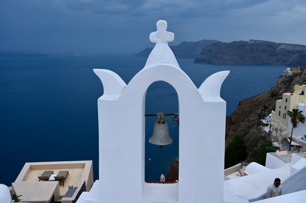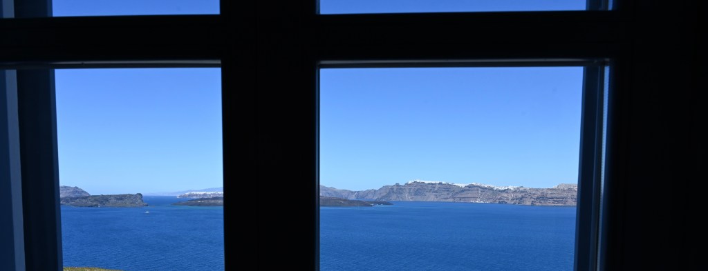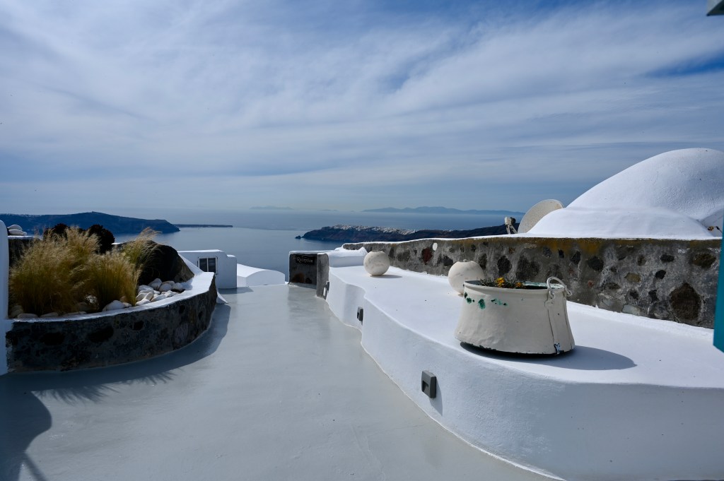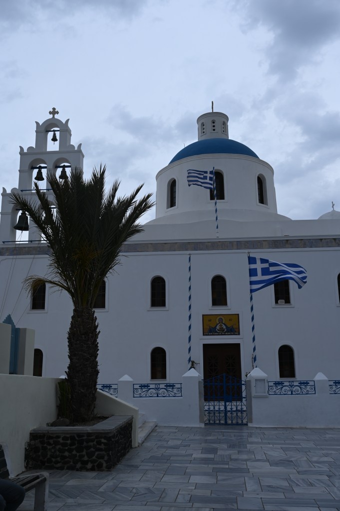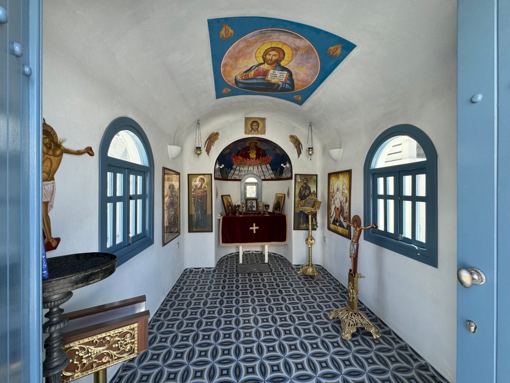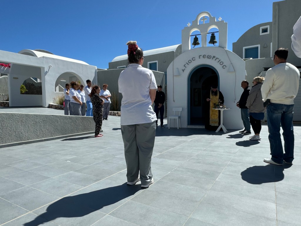 On a troqué notre véhicule de voyage contre un super hôtel de luxe ! Bon rassurez vous , c’est pas définitif ! Ca change quand même pas mal ! Superbe ! Avec une belle vue imprenable sur la caldeira ( mer intérieure de l’île ! Spa, solarium privé … oui c’est vrai on a pas ça dans TinHux ! La belle piscine … Un bel endroit pour le succulent breakfast du matin !La vue depuis notre lit … de quoi bien se réveiller le matin !!!Petite chapelle dans l’hôtel pour célébrer l’ouverture de la saison !Plein de charme et d’émotions dans la chapelle . Un petit tour à Fira, la capitale de l’île . 2500 habitants sur cette charmante ville vivante qui surplombe la mer Egée. De belles églises et une architecture atypique avec toutes ces maisons blanches … Avec plein de bougainvilliers , bref beaucoup de charme ! De jolies ruelles avec beaucoup de vie ! La vue carte postale de Fira ! Premier coucher de soleil vu de notre endroit … il y en aura plein d’autres !