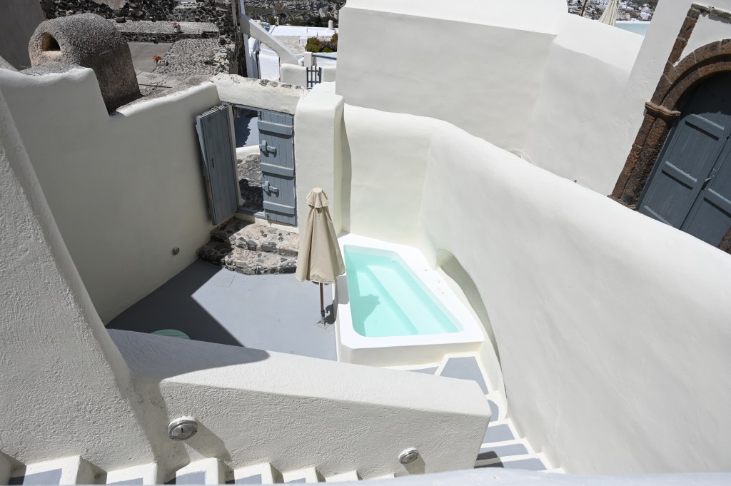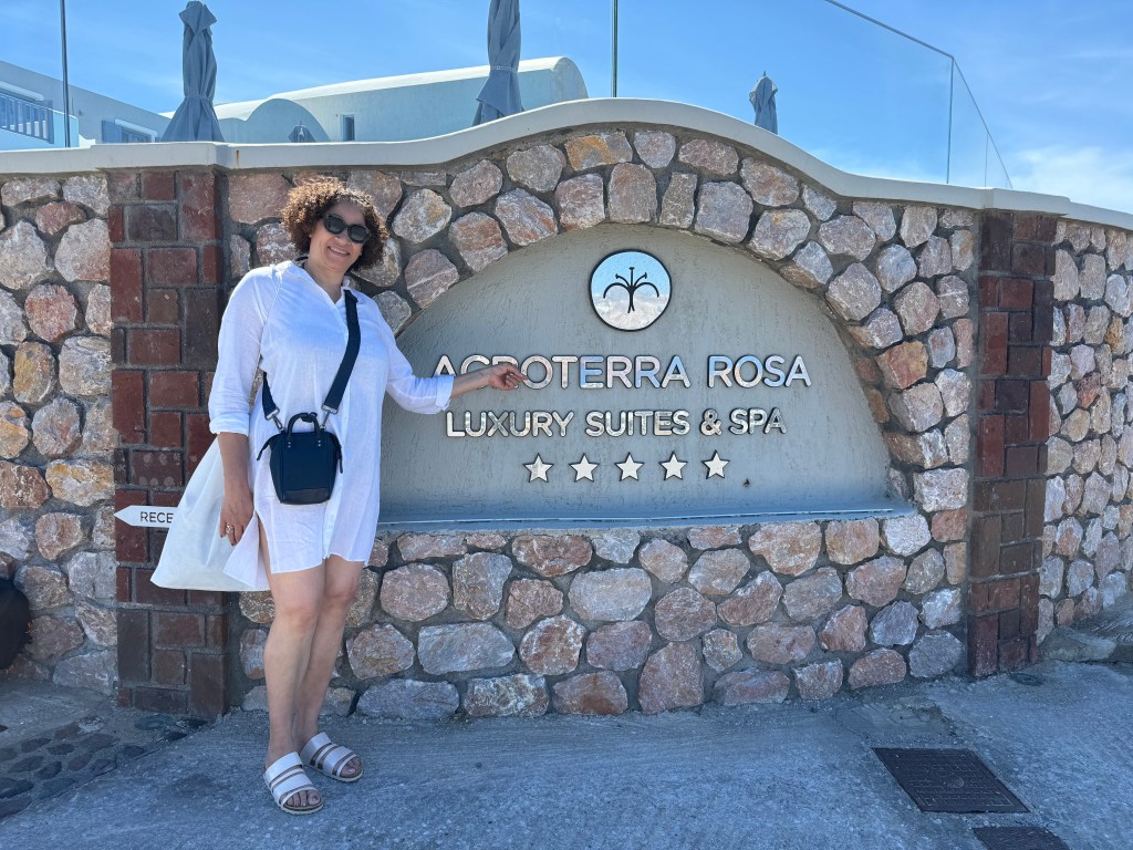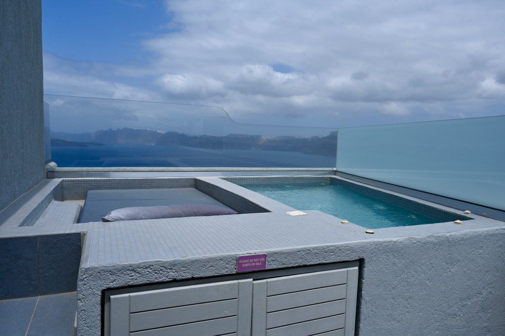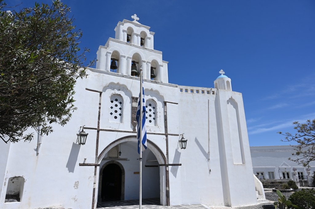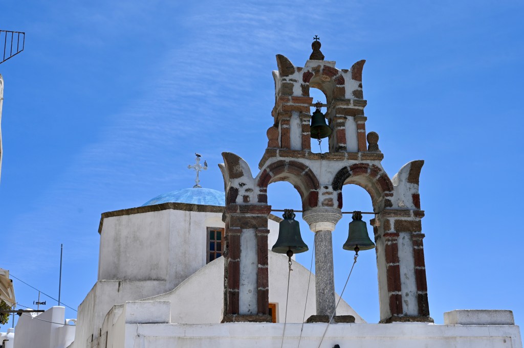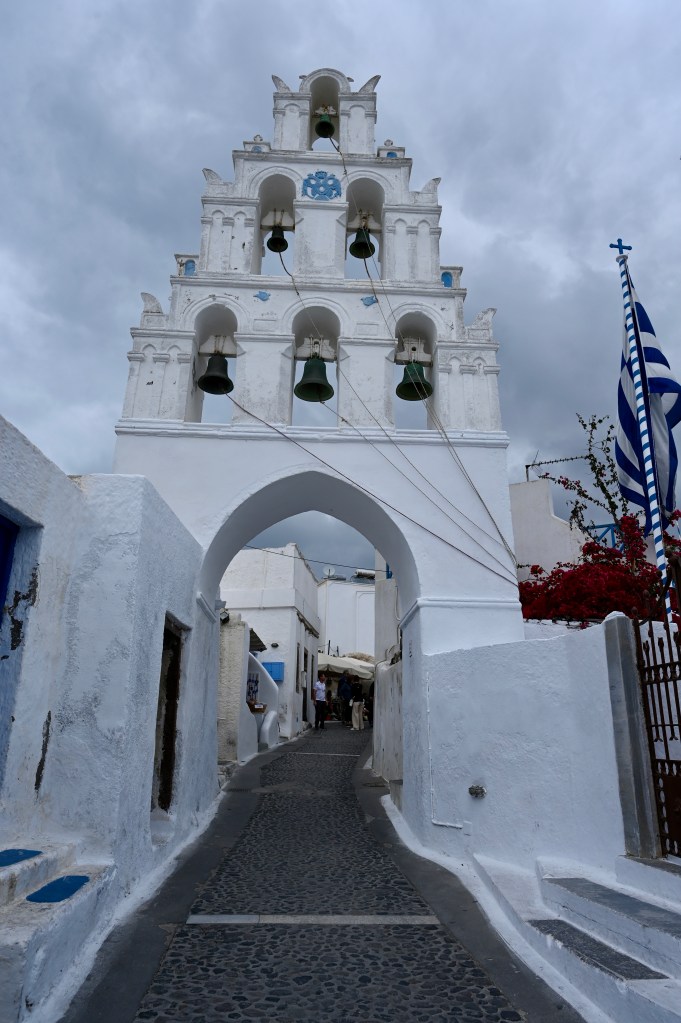 On a troqué notre véhicule de voyage contre un super hôtel de luxe ! Bon rassurez vous , c’est pas définitif ! Ca change quand même pas mal ! Superbe ! Avec une belle vue imprenable sur la caldeira ( mer intérieure de l’île ! Spa, solarium privé … oui c’est vrai on a pas ça dans TinHux ! La belle piscine … Un bel endroit pour le succulent breakfast du matin !La vue depuis notre lit … de quoi bien se réveiller le matin !!!Petite chapelle dans l’hôtel pour célébrer l’ouverture de la saison !Plein de charme et d’émotions dans la chapelle . Un petit tour à Fira, la capitale de l’île . 2500 habitants sur cette charmante ville vivante qui surplombe la mer Egée. De belles églises et une architecture atypique avec toutes ces maisons blanches … Avec plein de bougainvilliers , bref beaucoup de charme ! De jolies ruelles avec beaucoup de vie ! La vue carte postale de Fira ! Premier coucher de soleil vu de notre endroit … il y en aura plein d’autres !