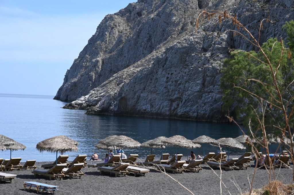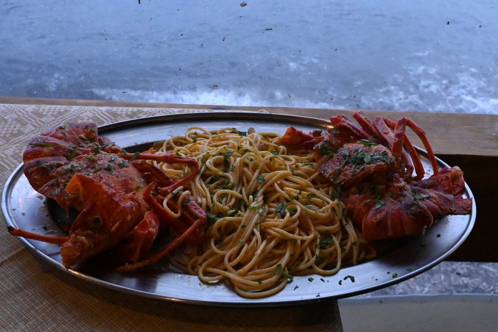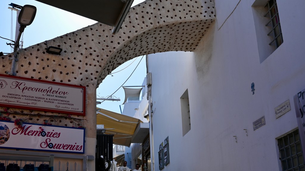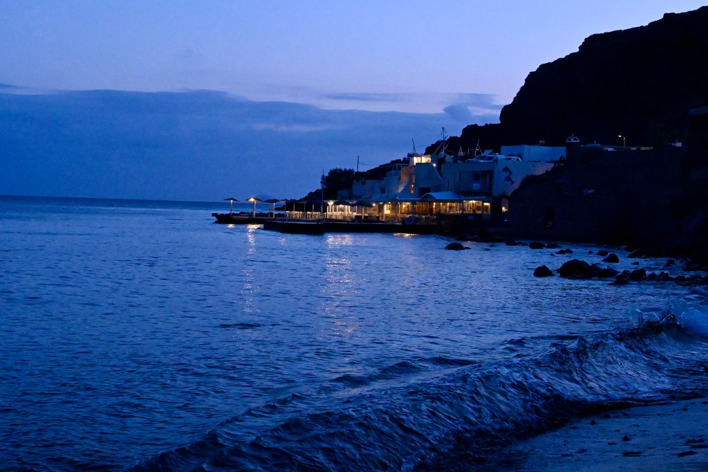 On quitte notre cocon, un petit pincement au cœur ❤️ Notre petit espace privé aussi ! Le petit village de Megalochori .. Avec ses charmantes ruelles étroites.. Ses petites places… Ses clochers richement décorés … Ses boutiques de créateurs … Bref, que du pittoresque ! Les provisions des fameux chats qui peuplent l’île ! Avec des ceps âgés parfois de plusieurs centaines d’années et cultivés en « corbeille », c’est-à-dire enroulés sur eux-mêmes ! Une petite plage improvisée … Petit ponton : là, il faut bien viser ! La plage rouge plein de de charme … Et pour finir en beauté, les pâtes à la langouste ! 🦞 Et pour finir le célèbre tiramisu pris à l’hôtel ! Petite lune, tu nous accompagne pour ces derniers instants… Dernière écume … Un voyage de noces … à renouveler ! Pas facile de fermer la porte 😢 😢😢