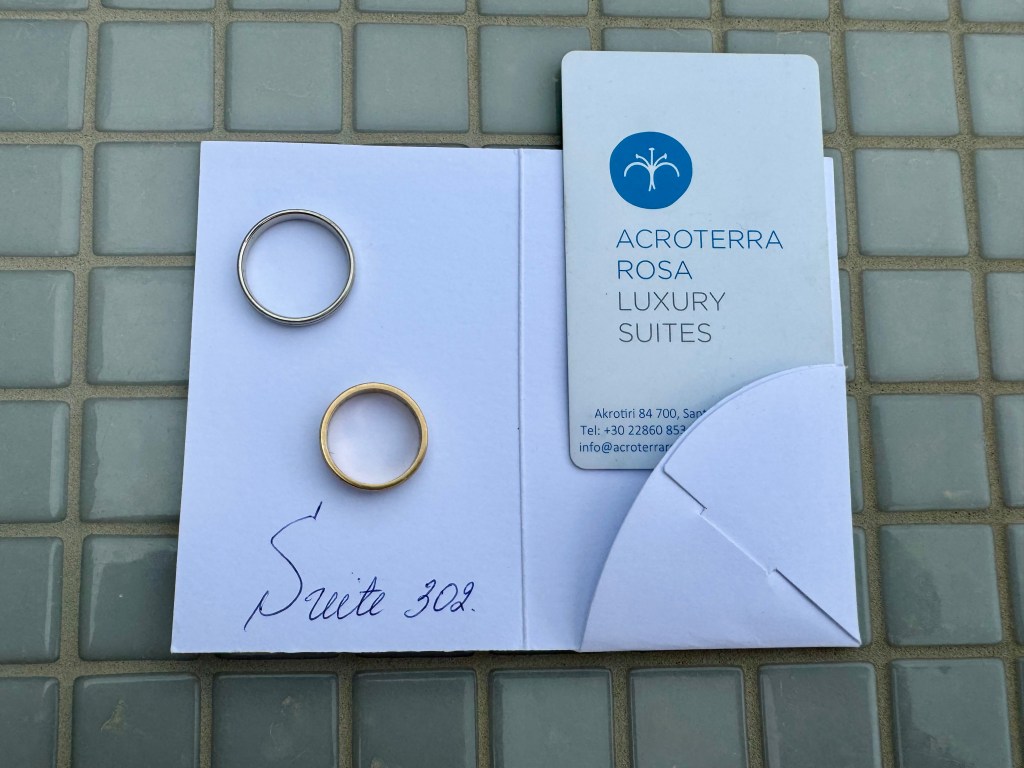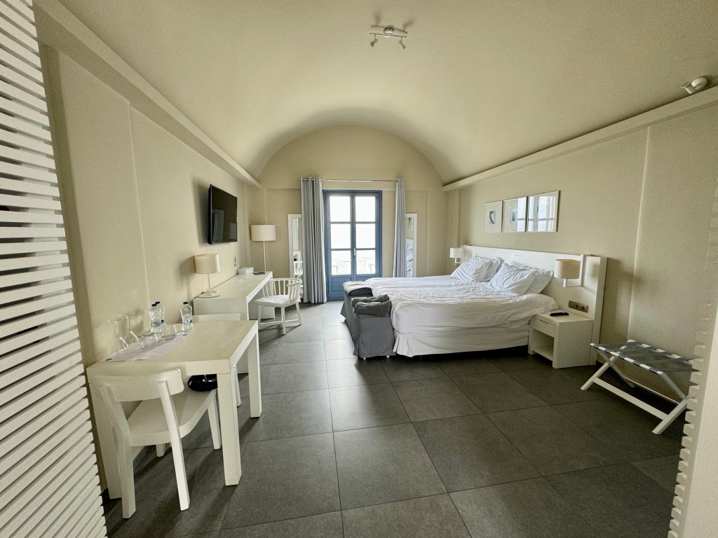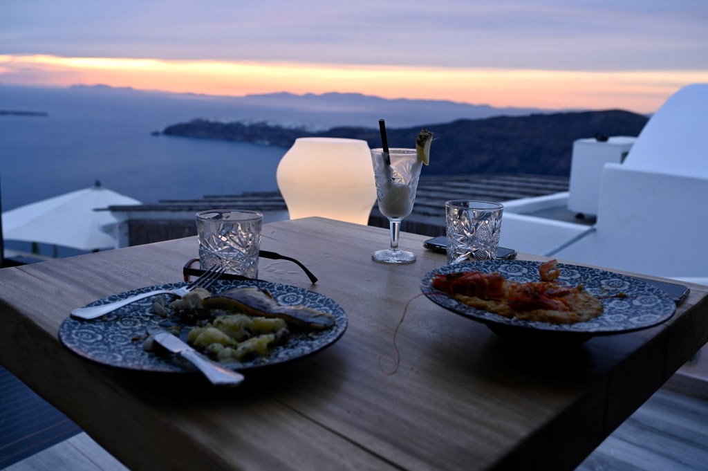 Après le royal petit déjeuner habituel cette semaine, Kate et Dimitri nous ont offert la possibilité de traîner un peu dans notre cocon jusqu’à 1 4 h . De quoi prendre son temps pour faire les valises (snif … ) et surtout prendre son temps pour profiter ☺️ de notre chambre tout confort ! Une fois dehors (!) nous avons visité quelques villages dont celui de Megalochori qui est pittoresque avec un labyrinthe d’allées sinueuses, de maisons blanchies à la chaux ainsi que d’églises surmontées de dômes bleus et de clochers richement décorés. Le tout donnant sur les collines environnantes qui sont couvertes de vignes, un endroit calme, serein et loin de la foule ! Le reste de la journée s’est passé tranquillement à profiter de l’île pour finir la soirée en mode romantique sur la plage rouge du Sud ! Un dernier dîner aux chandelles à la cave de Nicolas dans un décor typique. Au menu : pâtes à la langouste, c’était délicieux ! Pour finir, nous n’avons pas résisté à déguster le dernier Tiramisu tant aimé de notre hôtel l’Acroterra Rosa ! À 22h direction l’aéroport avec une certain pincement au cœur mais bon, inutile de parler des choses qui engendre de la tristesse 😢 !!!