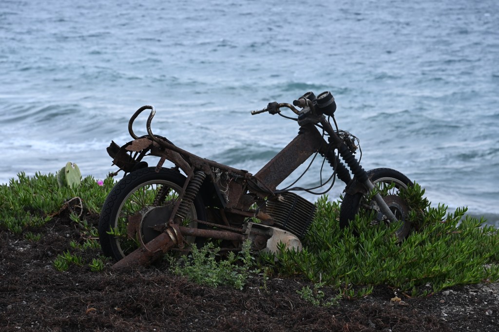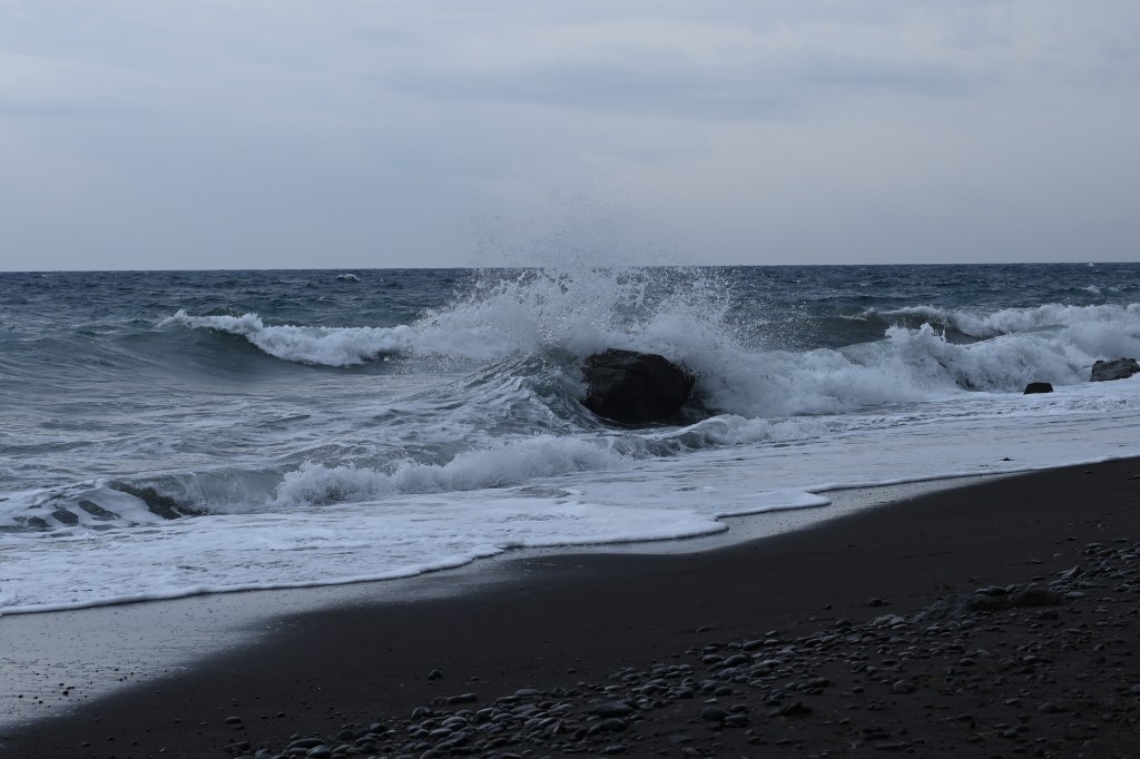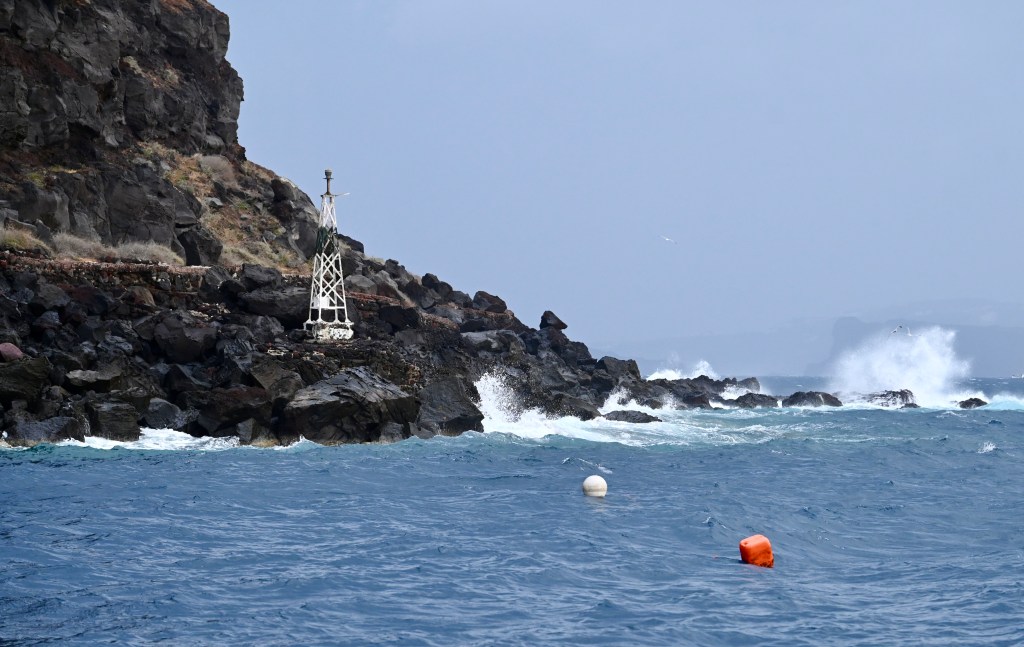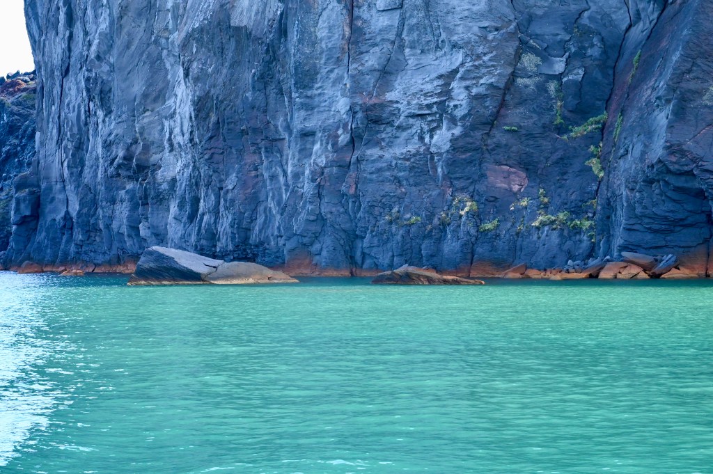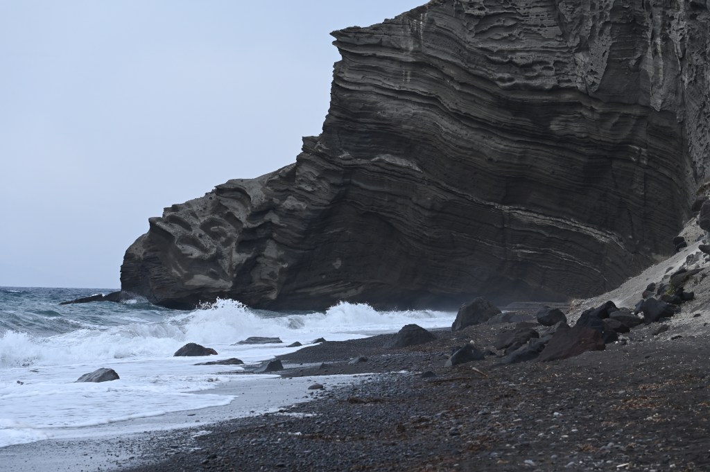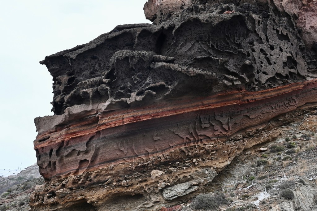 En route en mode navigation . Direction côte Sud ! Première curiosité, la plage rouge ! Puis les roches blanches … Très blanches même !Des strates assez impressionnantes Cette cote Sud est absolument magnifique ! On voit bien les effets de cette île volcanique . Une eau très cristalline … Écrin de structures de roches étonnantes !Dernier mile de la côte Sud dans un décor splendide !