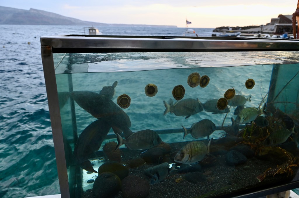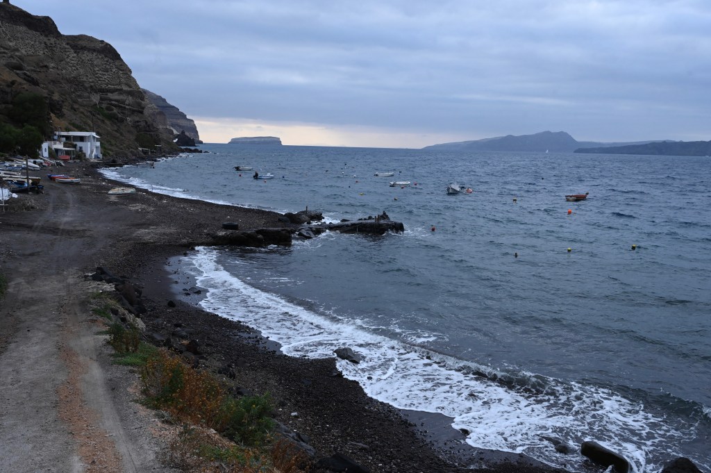 Le port de Athinios, principal de l’île où affluent les bateaux de tourisme et le ravitaillement !Nous sommes bien sûr une île volcanique ! La plage sauvage de Koloumpos Un sable toujours noir !D’habitude on peut s’y baigner mais aujourd’hui c’est un peu difficile, c’est froid et agité !Une drôle de « structure sur plage » !Mer et falaise, ça fait toujours bon ménage !Le passage volcanique ! Le gars, il a laissé sa Harley pourrir en bord de mer !!!Oia te voilà… la carte postale de l’île de Santorin !Terrasses avec vue imprenable ! Nous, on choisi celle du bout ! On peut y inviter la famille et les amis !!!Ici le blanc et le bleu, c’est du monochrome !Un cadre quand même assez unique !Le clocher avec la vue sur mer !Leïla, tu veux te remarier à Oia ?!!Le Sunset boulevard, ce ne devait pas être comme ça avant ! Mais à présent les touristes sont ravis !Mais non , ce ne sont pas des « nânes » !!!Une église orthodoxe Le petit port d’Ammoudi, très pittoresque !La mer particulièrement difficile aujourd’hui !Mais les valeureux capitaines n’ont même pas peur pour accoster, bravo !Notre restaurant de ce soir, le fameux Sunset by Paraskevas, délicieux et presque les pieds dans l’eau ! Le garde manger du resto !!! Le chef Etchebest ne pourra pas dire que ce n’est pas du frais !!!Allez, même s ‘il n’est pas au top, on vous montre le coucher de soleil vue de Oia !A demain pour notre dernier jour « amoureux » 😍
