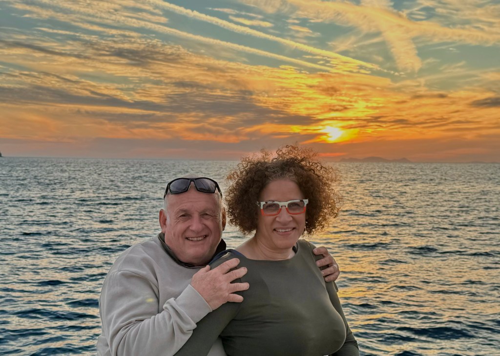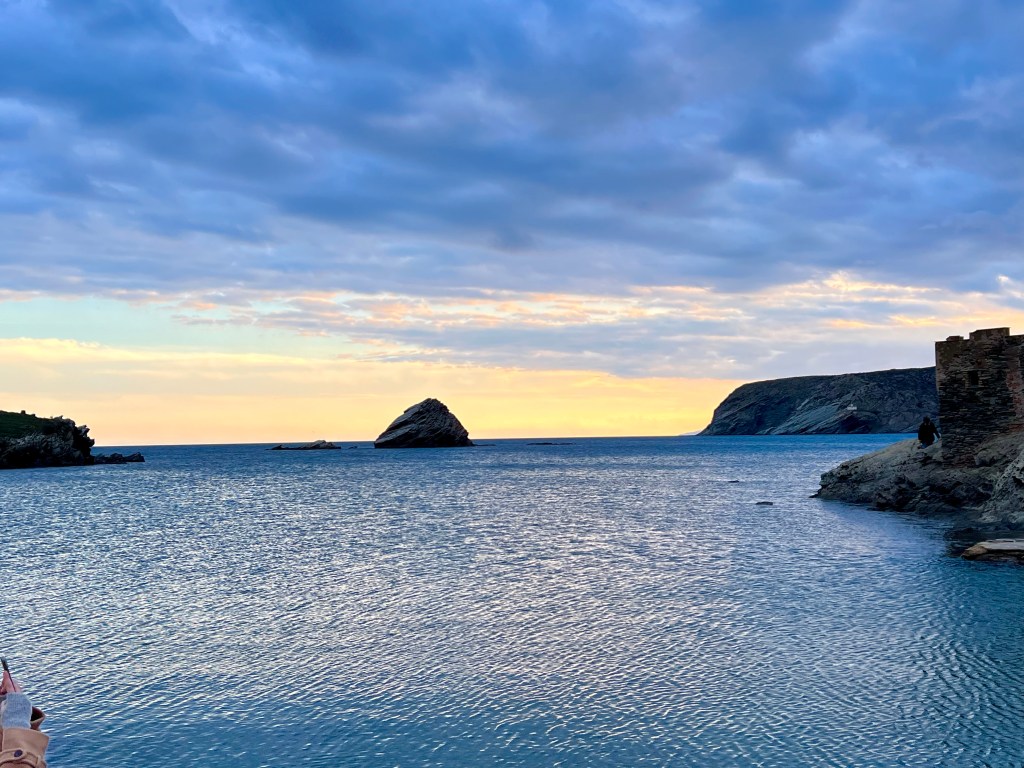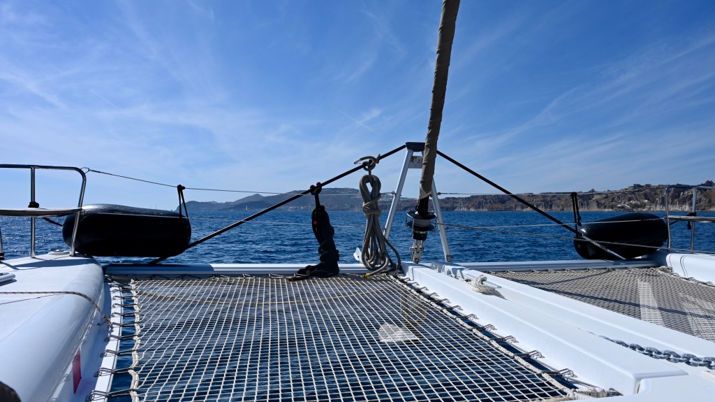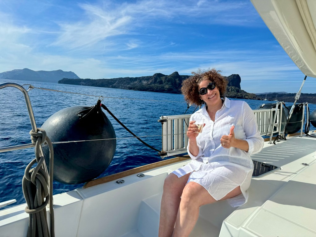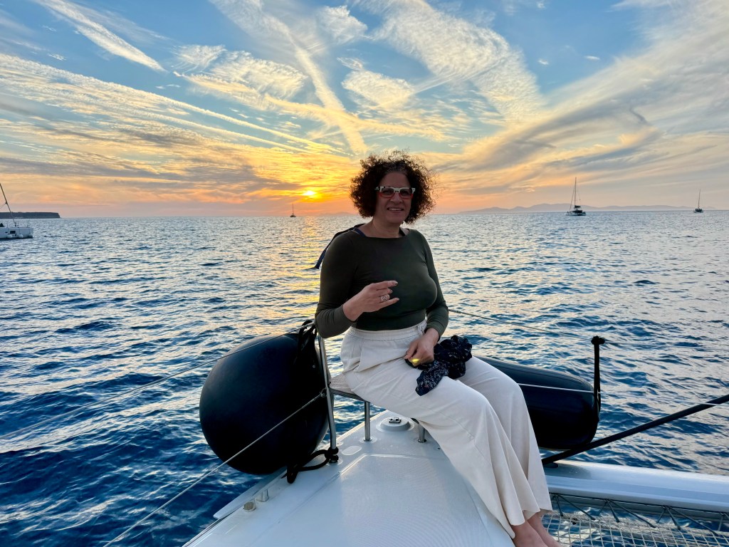 A bord d’un catamaran de 46 pieds ( environ 14 mètres), nous avons passé un moment de rêve. Pas de stress, on s’occupe de tout pour vous ! Un équipage aux petits oignons avec un excellent capitaine. Boissons à volonté, un repas succulents avec poisson frais et gambas , le tout dans un décor plein de charme , une expérience incontournable avec un prix au vu de la qualité, très raisonnable . Et que dire de ce fameux coucher du soleil … A bord , un point de vue vraiment inédit … Le soleil plonge dans la mer Égée à l’ouest, embrasant les autres îles de l’archipel, tandis qu’à l’est, la lumière fait scintiller les bâtiments blanchis à la chaux des villages côtiers. Ça c’est du romantisme et c’est vraiment beau 🥰 !