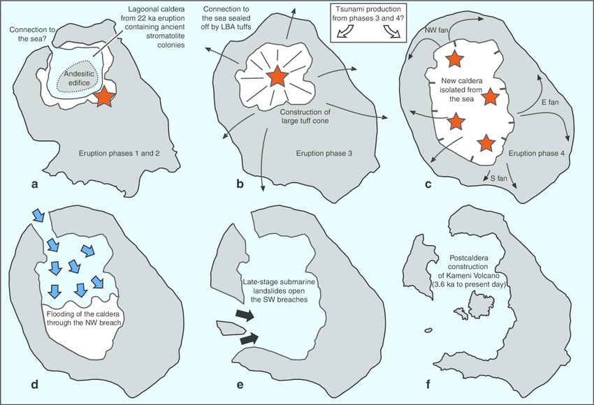 À l’origine, avant l’an -1500, l’île de Santorin n’était qu’un seul bloc . L’île volcanique s’est transformée en un archipel de 5 îles avec un lagon suite aux tsunamis, éruptions volcaniques et autres phénomènes naturels. On appelle ce type de formation une Caldera, vaste dépression circulaire.