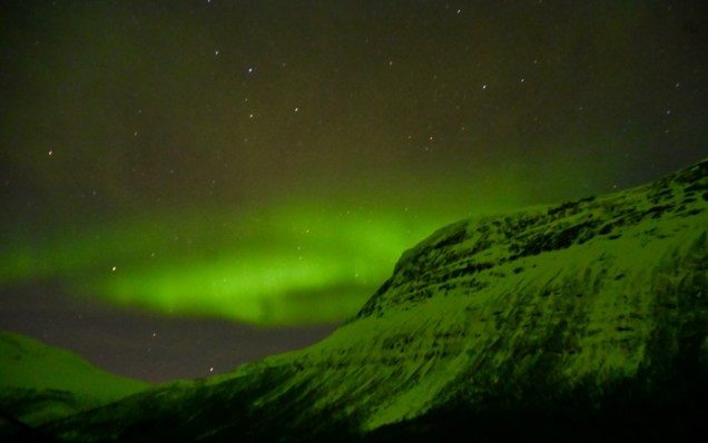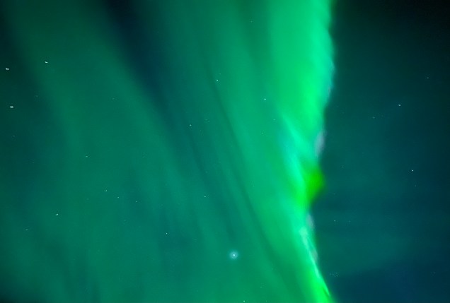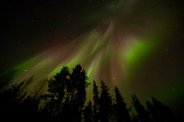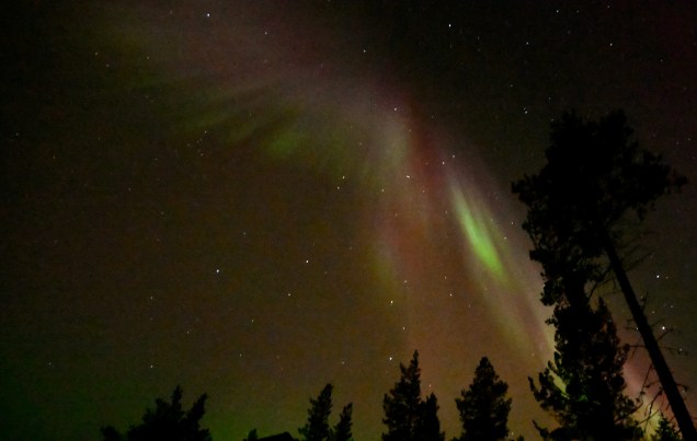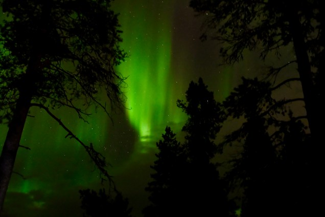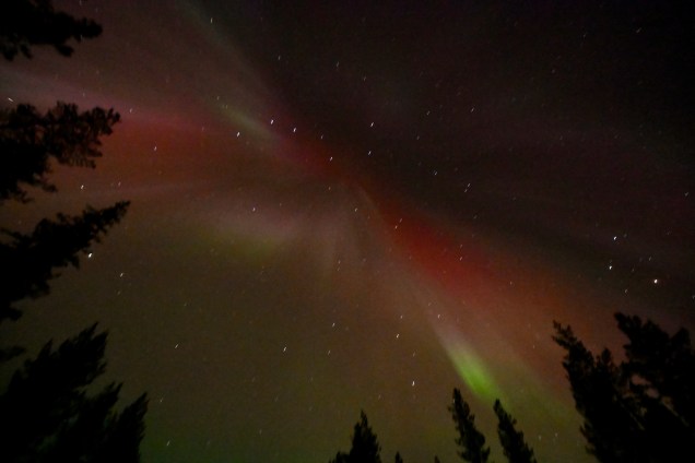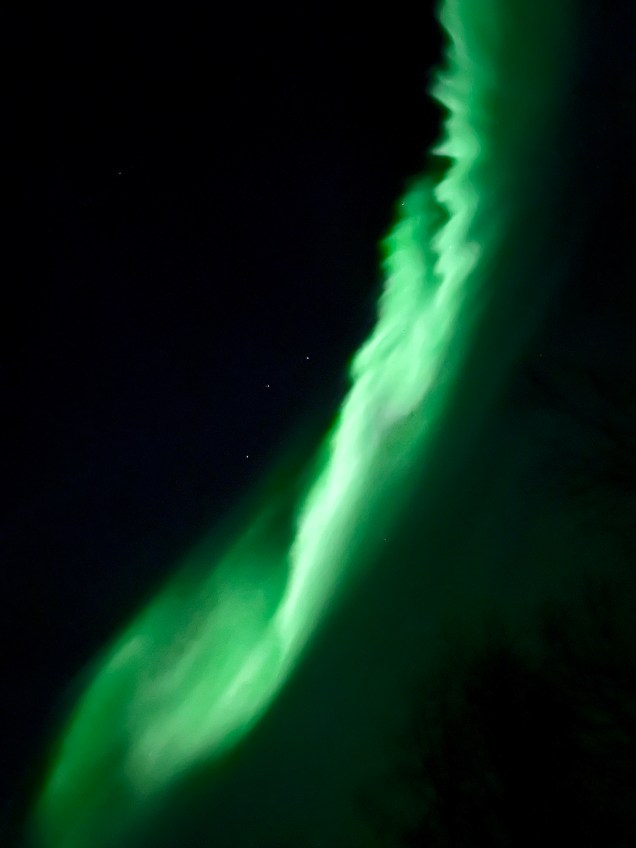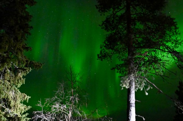 Ce soir nous dormons en pleine forêt et toujours l’échelle dans la neige cela doit faire 3 semaines que c’est le cas ! Un ciel clair, une température basse (-8° ) il n’en faut pas plus pour la venue des copines boréales, ce soir c’était « oh là là chi oua oua » ! Un véritable son et lumière , le son étant la voix de Pierre décrivant le ciel avec une intensité qui faisait contraste avec le silence de la forêt enneigée … pas besoin de micro ! Conclusion, certes sous le cercle polaire mais toujours en Laponie magique !