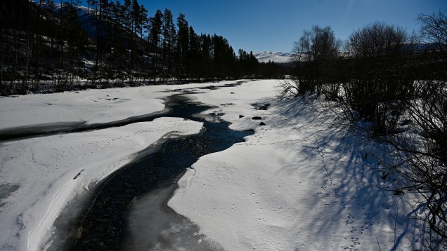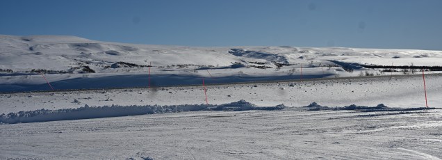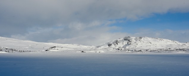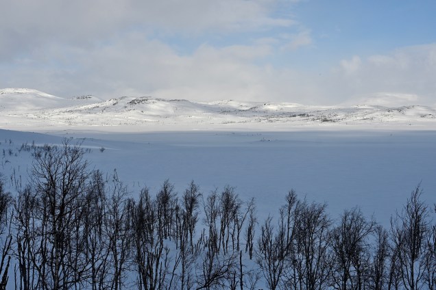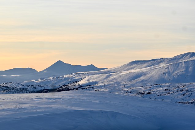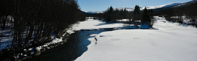 Nous avons donc traversé le massif de Rondane sur la route 27 qui est une des routes les plus sinueuses du Pays avec des cols à plus de 1100 mètres. En altitude cela vous paraît peu mais la neige omniprésente vous transporte dans une ambiance fabuleuse. Points de vues sur les plus hautes montagnes du pays, ruisseaux qui découvrent leur sillon à travers la neige, lac encore gelé à cette époque de l’année, virages avec changement de scène à chaque instant et puis le plateau principal comme on les aiment avec le manteau blanc qui recouvre tout avec son écrin nacré par le soleil ! Vous rajoutez la pincée de silence et vous êtes ébahis, étonné … de la nature à plus soif ! L’avantage de découvrir ces espaces l’hiver, c’est que cet endroit doit être très touristique l’été et là, une fois de plus nous étions seuls !