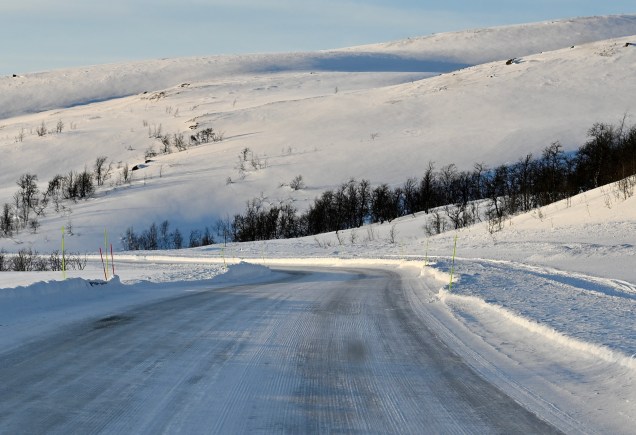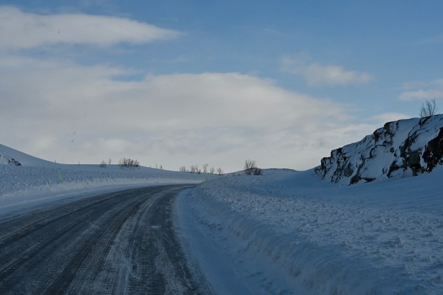 Risksgräsen > Kiruna (67.51 Nord / 20.13 ° Est ) : 235 kms . Route enneigée et verglacée