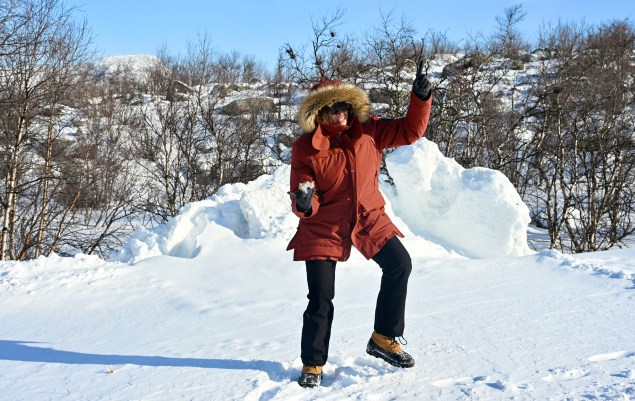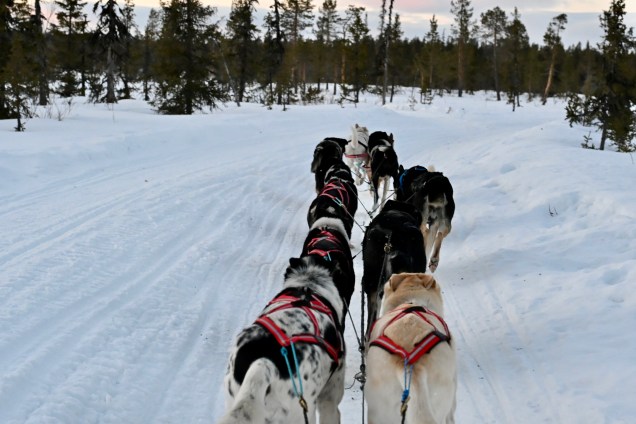 Dès le matin c’est vue sur la neige des hautes montagnes ! Ouf, la verrière est levée … nous continuons la route ! La route est dégagé mais très verglacé, pas de salage de route ici ! La nature se lève, nous sommes dans notre élément de vadrouille ! Une certaine immensité ! Le lac … immense ! Pieds sur frein, les Reines traversent en majestés !Tout le troupeau y passe !Direction en face dans les alpages ! En liberté c’est quand même autre chose ! Nous arrivons à Abisko, une petite gare adorable ! Les rails enneigés du fameux Stockolm – Narvik ! Abisko et son immense parc National est très prisé pare les randonneurs Sculpture de neige et de glace … une gueule de requin ? A la pompe à essence, plus de motos neige que de voitures ! Petit stop du midi, elle est heureuse la fille dans le paysage enneigé ! Un barbecue d’été … il est coincé l’hiver ! Kiruna et sa fameuse mine ! Une exploitation à présent loin de la ville où les maisons ont été déplacées une par une ! Un chantier titanesque encore non terminé !Au final, une grande ville avec un certain charme ! La neige magnifie toutefois les choses ! Le train Stockolm – Narvik part de Kiruna !Les chiens de traîneaux nous attendent patiemment ! Le Musher qui va conduire notre attelage, il est tout heureux de son métier ! Et c’est parti à travers lac et forêt ! Sous la commande du boss ! Le tout avec le coucher du soleil s’il vous plaît ! La cabane tipi bienvenue ! Un petit feu nous attends, il fait déjà -10° !De quoi se réchauffer… ah, l’amour ! De plus chocolat chaud et pain polaire Suédois au fromage ! Nous voilà repartis mais de nuit cette fois ! Cliquez ci dessous pour un bout de vidéo nocturne !