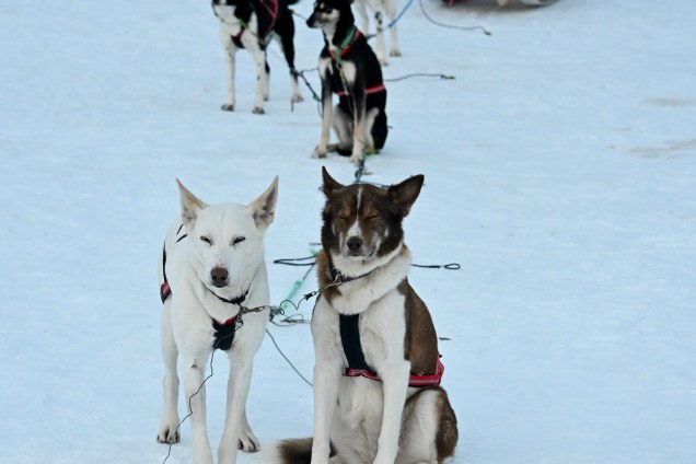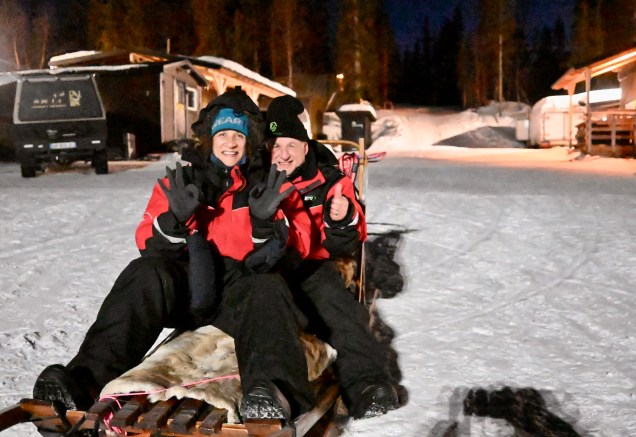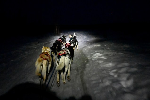 Si, si… le loto de la vadrouille existe, nous l’avons touché aujourd’hui ! De la neige de partout, des reines qui traversent la route, des paysages incroyables, une grande balade avec des chiens de traîneau sous le coucher du soleil s’il vous plaît, un petit feu dans un tipi avec chocolat et galette locale et pour finir la soirée de belles aurores boréales. On est riche de tout , fatigués de tant de bonheur ! Ce soir, le lit est froid (-12°) mais on se réchauffe vite des images vécues !