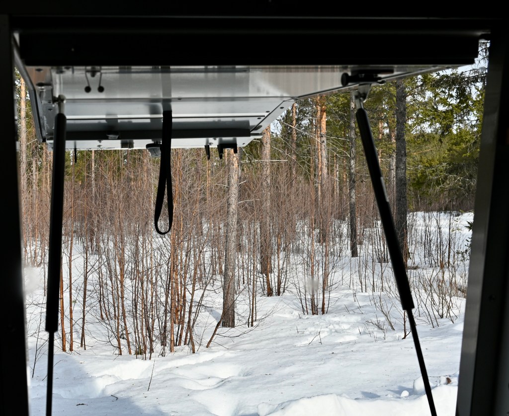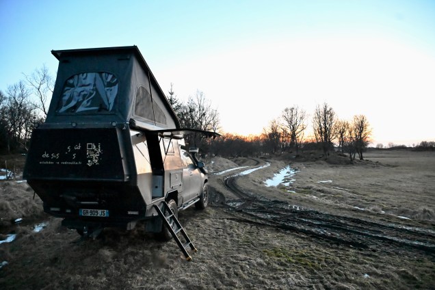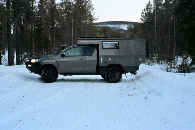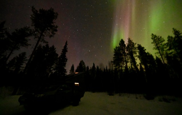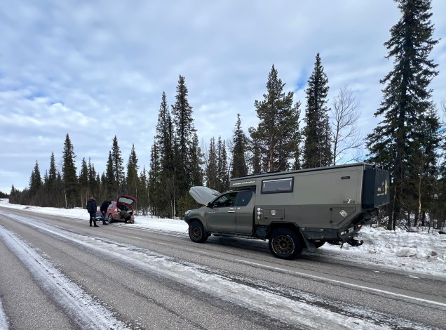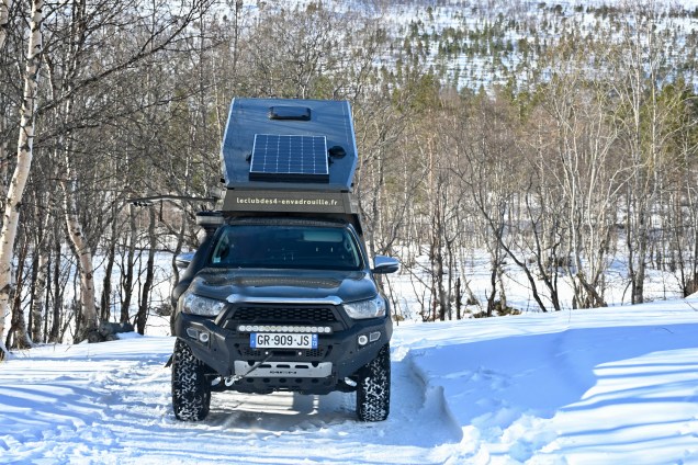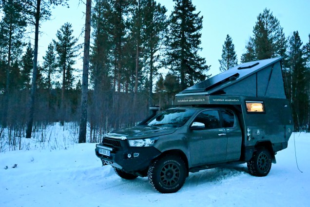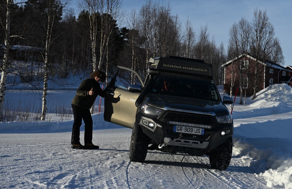 Plus de clous, snif ça sent le retour ! Quasiment plus ne neige sur la route à présent . Sur les bas-côtés encore pas mal ! Près d’un barrage, la glace commence à fondre , c’est le printemps aujourd’hui, non ? Toujours les mecs gelés mais attention quand même ! Leïla , conductrice chevronnée ! On passe le cercle polaire pour le retour ! Des d’autocollants de voyageurs… mais visiblement l’hiver il n’y en a très peu … nous n’ avons croisé qu’un seul véhicule d’expédition depuis le départ : un Italien ! Le soleil se couche ! Erreur de casting en cherchant le bivouac du soir, on se retrouve sur une piste de motoneige ! Un demi tour un peu juste avec peu de place ! Finalement bivouac trouvé en pleine forêt enneigée … trop chouette et quel silence ! 🤫 Notre bivouac avec TinHux 2 sous les étoiles et les aurores ! Spectacle en forêt !Un arc en ciel en pleine nuit ! Du rouge, du vert ! On resterai des heures à contempler tout ça ! Allez, le bouquet final !
