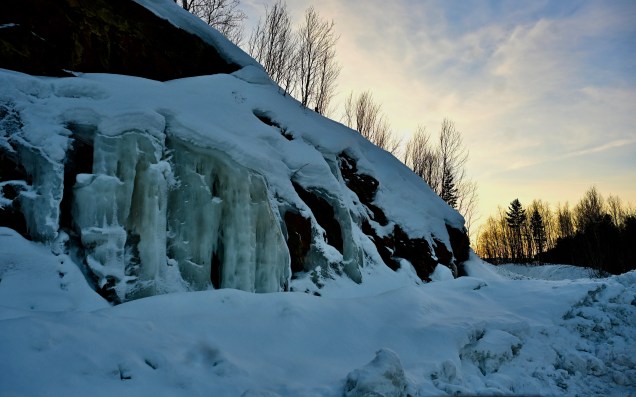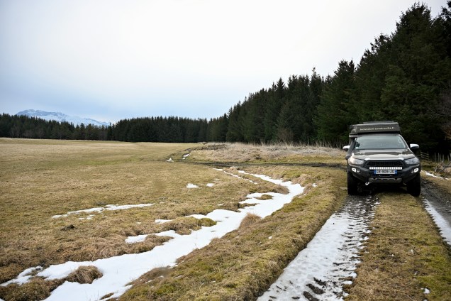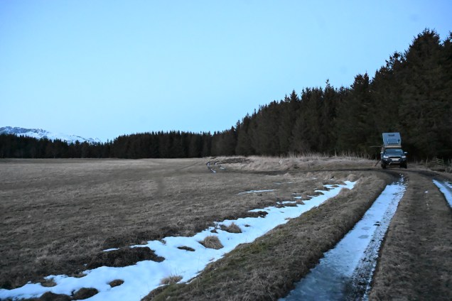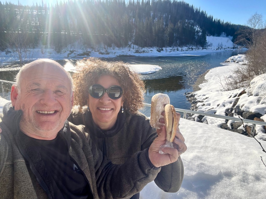 Encore un beau coup d’œil au réveil … quand on vous disait que nous la plus belle maison du monde ! Le capot de TinHux 2 bronze dès le matin ! On reprends la route !Encore les roues dans la neige ! De suite, une route qui assure … loin de la route principale ! Un ruisseau qui se fraye son chemin dans la neige ! On entame la superbe route 27, cliquez sur le lien vidéo ci dessous pour l’ambiance .