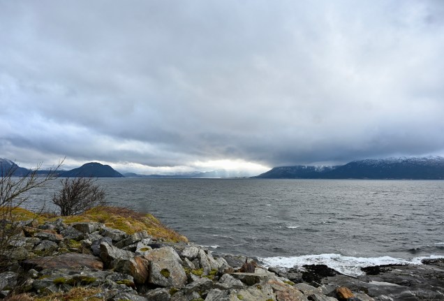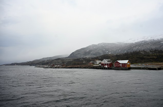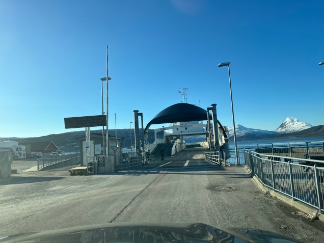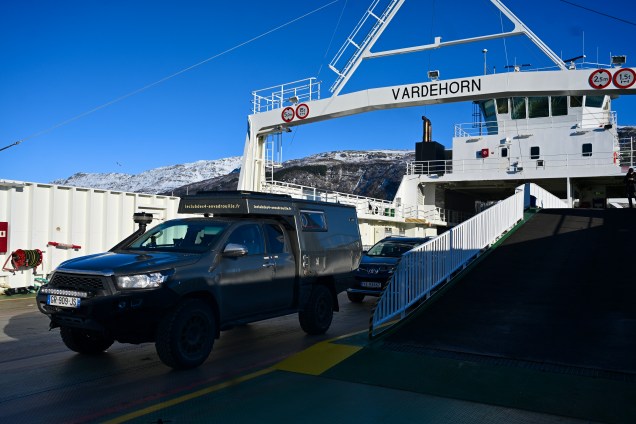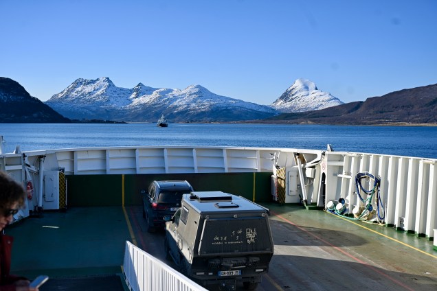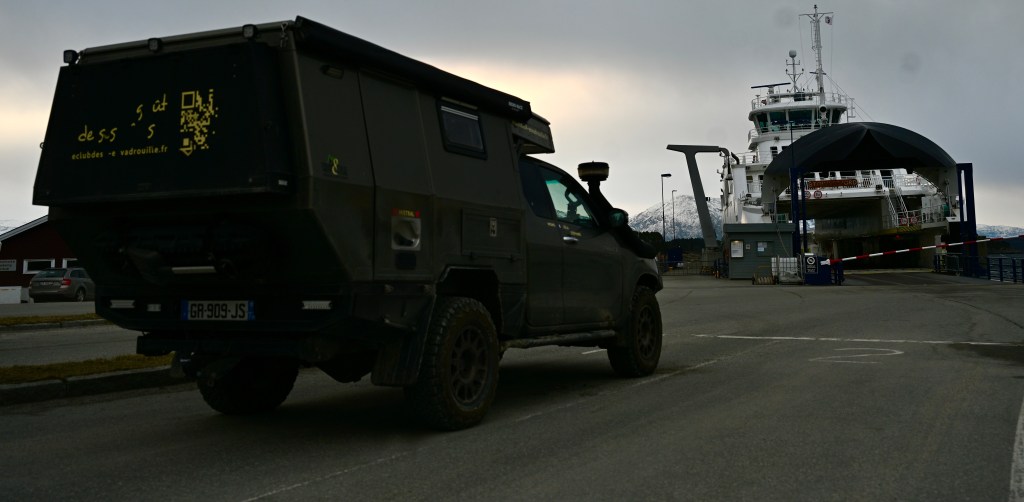 On quitte le petit nid de notre bivouac … temps maussade ! Premier ferry, dès 8 heures ! Dès le départ, avis de tempête, ça bouge ! Navigation en direct à bord ! Le temps très instable aujourd’hui , mais la lumière changeante reflète bien la météo du coin ! Plus de 2 heures sur l’eau aujourd’hui ! Un des ports de notre navigation ! Entre chaque port, les kilomètres de la route offrent de joli points de vue ! Avec parfois des rayons de soleil qui font ressortir la belle eau verte des fjordsAh, un autre ferry arrive ! TinHux 2 commence à connaître les embarquements ! Les maisons rouges typiques le long de la côte ! Parfois, elles se fondent dans le paysage … D’autres fois, c’est un autre charme, on ne voient qu’elles ! La tourbe, type de chemin en ce moment ! Hop, un chemin de neige, TinHux 2 est comme un fou, il en profites ! La neige parfois fait sa réapparition, on adore ! 🥰 Les lacs craquent la glace, attention à ne pas aller dessus avec un pouf en eau froide assuré ! Joli coin sur la 17 Après une longue route et de belle traversée, un bivouac mérité chez l’habitant avec une belle vue !