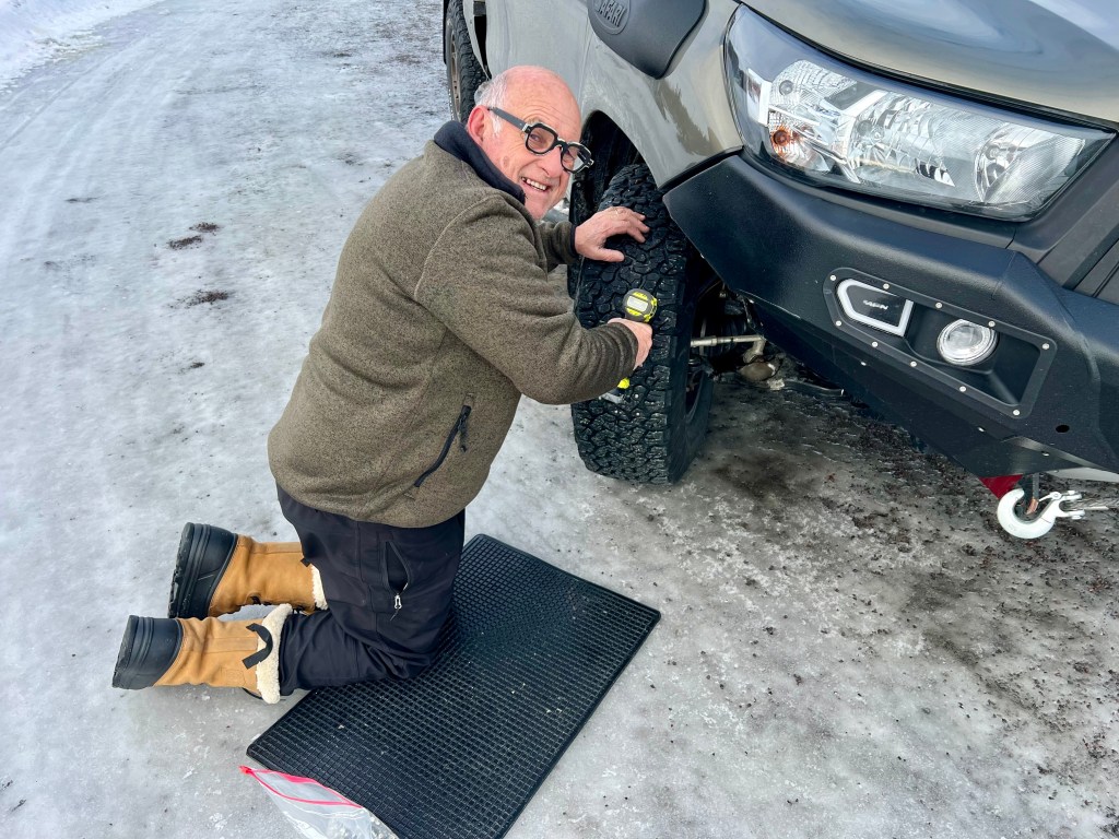 Le dilemme du jour n’a pas duré très longtemps : retirer ou non les clous? Les premiers kilomètres sur routes sèches nous on bien fait comprendre qu’il allez falloir quitter les petites pointes au tungstène ! Opération commando sur un parking et l’histoire a duré moins de 2 heures ! La dépose est plus rapide que la pose, moins de question à se poser notamment sur l’emplacement , il suffit juste de dévisser les 500 clous ! Nous avons à présent retrouvé le plaisir la conduite de TinHux 2 avec plus de silence et une meilleure tenue de route ! Certes, nous faisons plus attention dans les portions où il existe encore un peu de neige et glace , mais au global le compromis est meilleur !