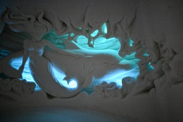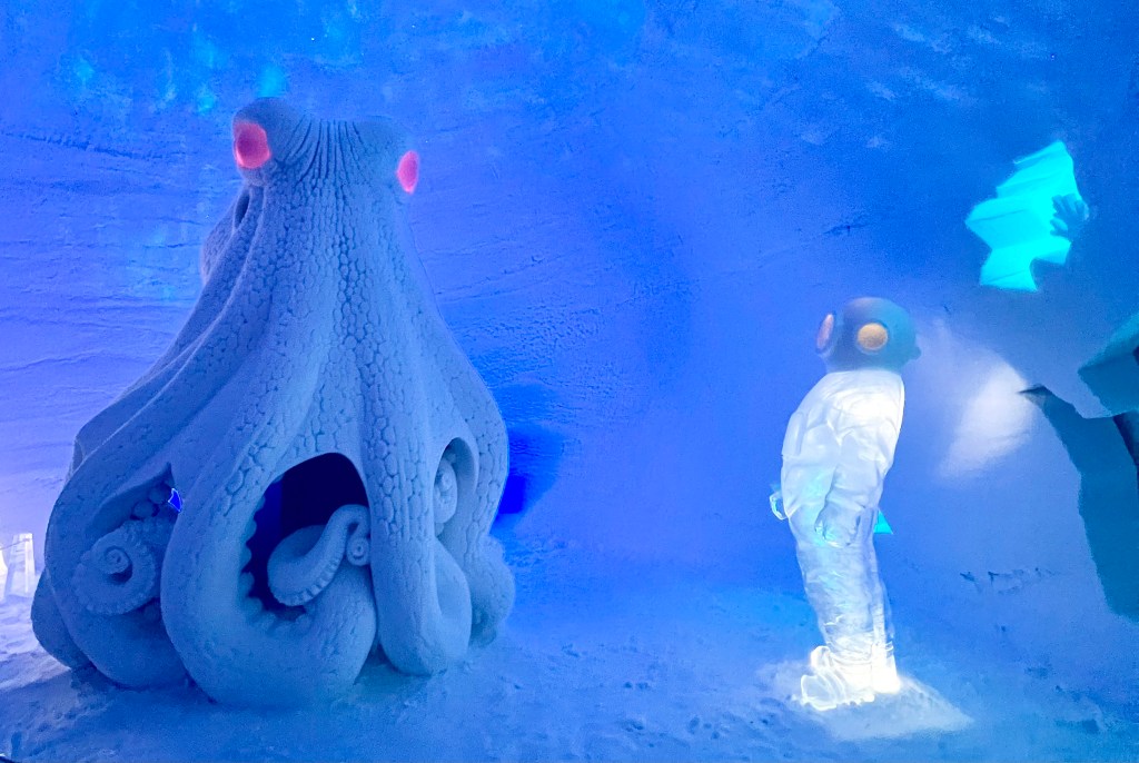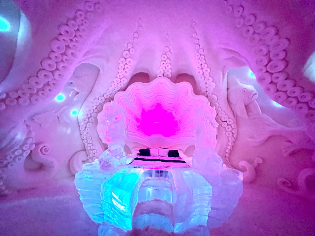 Le Snow Village est une expérience assez unique avec une superficie d’environ 4000 mètres carrés. Près de 45 000 mètres cubes de neige et 400 tonnes de glace naturelle cristalline sont utilisé tous les ans pour la construction. La visite du lieu séduit de suite … un travail titanesque pour un rendu extraordinaire. Un décor de glace avec des détails époustouflants, des jeux de lumières magnifiques, une ambiance vraiment particulière. Une œuvre éphémère mais qui reste dans nos mémoires assurément. De plus le circuit est extrêmement bien organisé avec notamment des issues de secours surtout pour Pierre, l’homme le plus claustrophobe du monde !!!