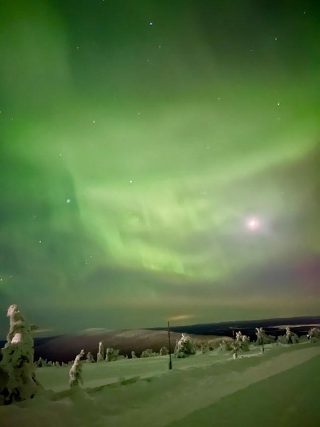 Petit retour la nuit d’aurores d’hier … Uu de nos objectif pour cette vadrouille était de réussir à observer les aurores boréales ! La chasse n’avait pas été fructueuse avec Pierre et Stéphanie mais hier soir, c’était le jack pot ! Les aurores ont des tempérament de « diva » et observer leurs lumières qui dansent infatigablement dans le ciel est une expérience à ne pas manquer ! Au départ, pour leur chasse, nous avons suivi « le troupeau » ou tout le monde s’est retrouvé sur le lac près de Levi . Mais pour les,trouver, il vaut mieux ne pas être exposé à la pollution visuelle et se dégager davantage ! TinHux2 nous a transporté en haut d’un col et la , miracle… le ciel était inondé de ce qui est départ d’immenses traînée blanches dans la voie lactée ! A l’œil nu petit à petit les couleurs flamboyantes se sont concrétisées et c’est bien rare qu’elles apparaissent ainsi . Nos appareils photos amplifient le spectacle grâce à leur poses longues mais là hier soir, le spectacle coloré était visible à l’œil nu . Mais au fait qu’elle est l’explication de ce phénomène ?