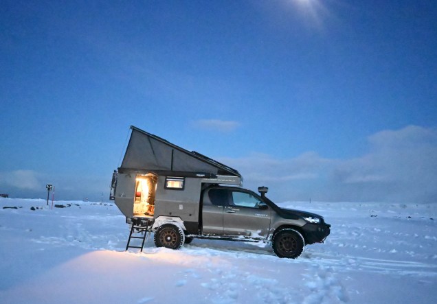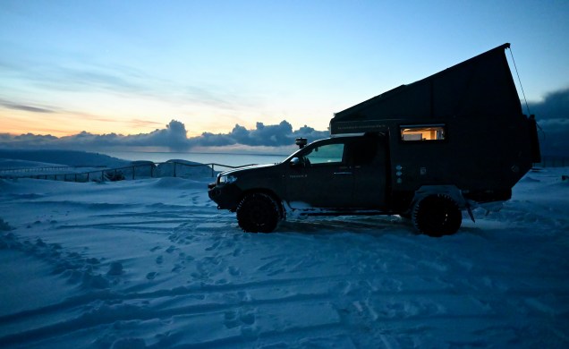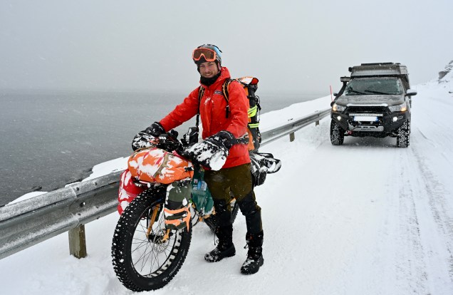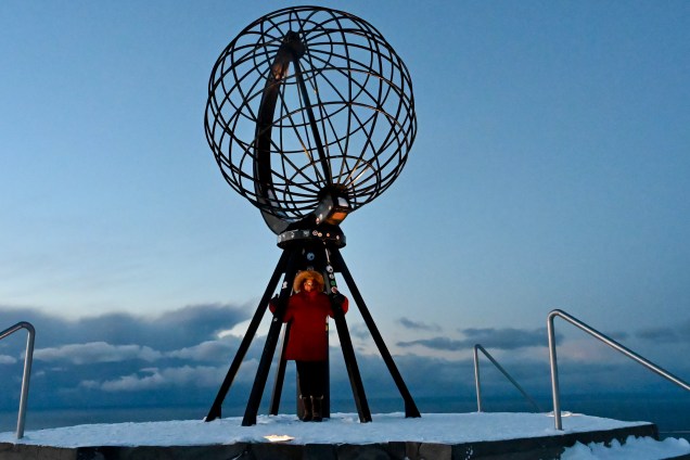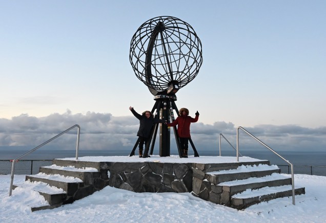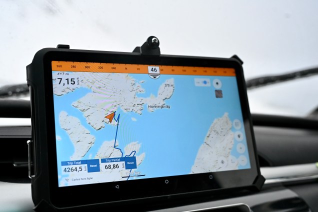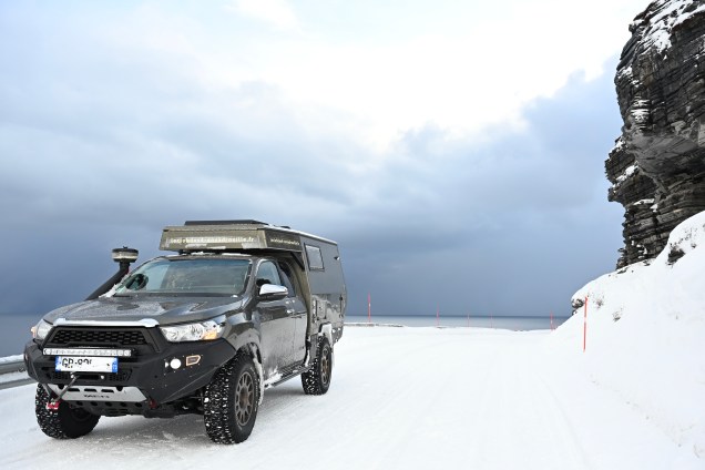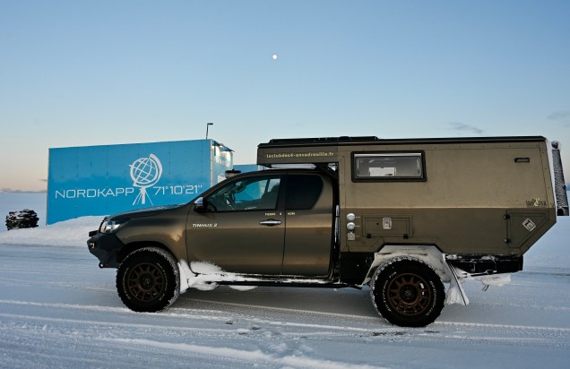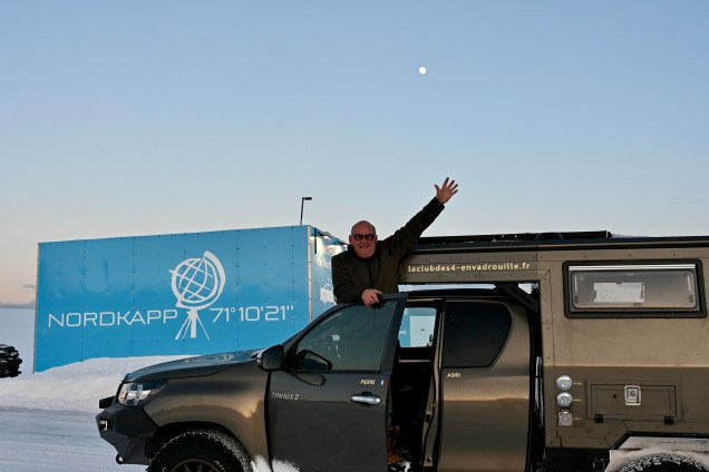 Un chasse neige , très utile ici … il a pas mal neigé aujourd’hui !Parfois même en tempête avec beaucoup de neige et une visibilité délicate ! Et parfois le ciel se déchire et nous donne un décor immense ! TinHux 2 vit un rêve sous ses roues ! Qui entassent bien la neige sous le châssis De petits villages de temps en temps … Ici un petit port qu’on dirait du bout du monde ! Des rochers avec des strates …Tunnel entre les îles qui passe sous la mer ! Preuve en est par notre logiciel de navigation ! Pont pour aller à l’île du Cap Nord : MagerøyaLa ville de Honningsvåg, dernière civilisation avant la montée vers l’espace du Cap Nord Son port avec de gros tonnages pour la pêche ! La dernière barrière avant le bout de la route . Parfois avec du mauvais temps extrême l’ascension se fait par convoi ! C’est parti pour les derniers 26 kms ! Ça monte à 9% . La tempête au plus fort, on ne voit pas à plus de 20 mètres … Puis l’aphotéose, rien que pour nous (!) , le ciel se déchire une fois de plus … La route apparaît de nouveau !TinHux 2 n’en revient pas lui même ! Des dunes … mais de neige ! Skarsvåg, le village de pêcheurs le plus septentrional du monde ! Nous irons demain … L’assaut final… Avec les nuages posés sur la neige, jamais vu ça ! Le cap mythique, c’est lui ! Un paysage à couper au souffle ! Les nuages sombres comme pour accentuer cet espace mythique qu’est NordKapp TinHux 2 le vaillant , il ne sais plus où mettre ses roues, il n’y a plus de route ! Pierre en rêvait depuis tout petit ! On n’y a plus de route ! En face, juste le pôle Nord ! Le monument des Enfants du Monde qui se compose de sept grands reliefs circulaires disposés verticalement On immortalise, on est au pied du globe ! Leïla , n’en revient pas d’être à cet endroit … Une symbolique pour Pierre, la larme à l’œil bien sûr ! Des instants magiques ! TinHux face à la falaise, son plus beau bivouac pour l’instant ! on prépare la nuit … l’échelle au « bout du monde « ! Pierre silicone les caoutchoucs de portes, il faut que ça s’ouvre demain ! Vent et froid de prévu ! Bientôt plus de lumière … La dernière image témoin de cette folle journée … la nuit risque d’être bonne même si elle est ventée !