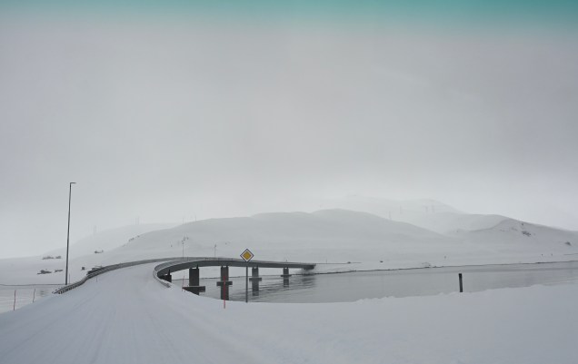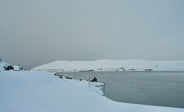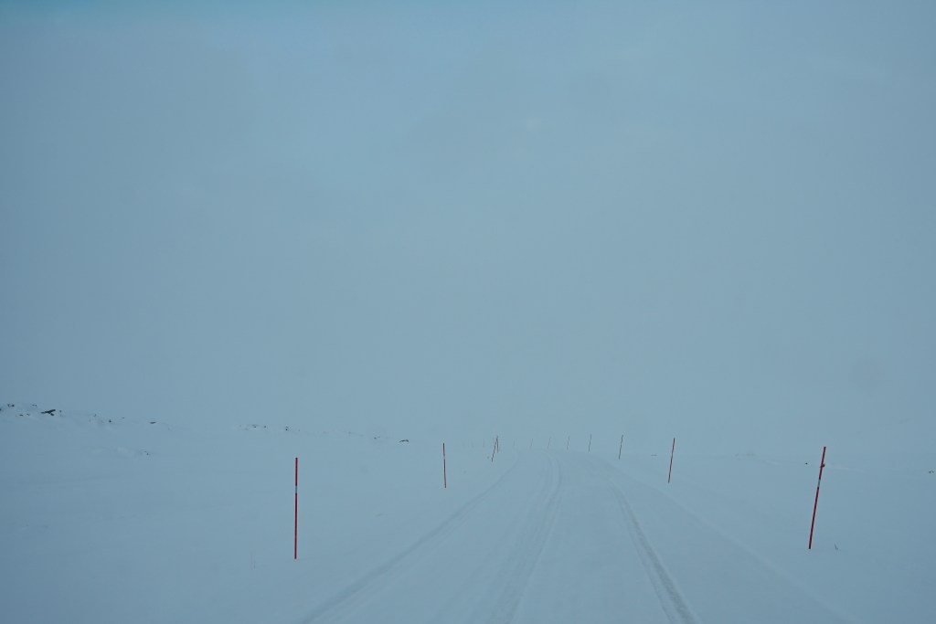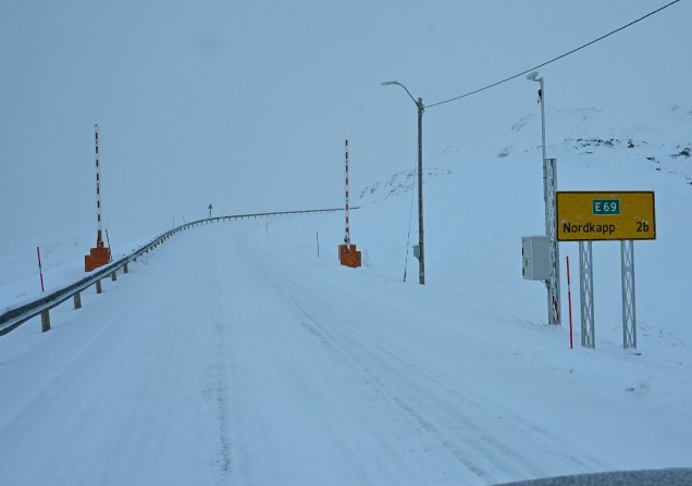 Laksel > NORDKAPP (71.10° Nord / 26.46° Est ) : 213 kms . Tempête de neige et route enneigée