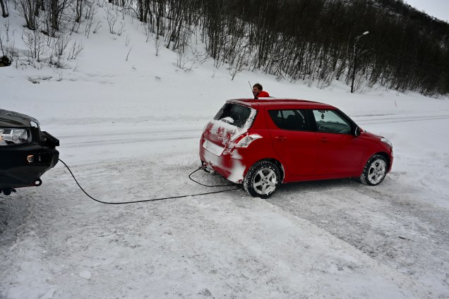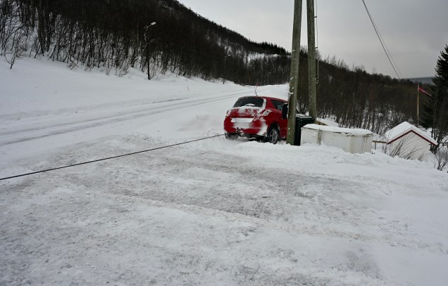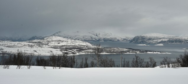Grosse route aujourd’hui, notre objectif était d’être au pieds des îles Lofoten ce soir, mais il nous a manqué 50 kilomètres dans l’objectif. La tempête de neige a eu raison de nous, à la fin même pour trouver un bivouac dans le noir et la route que l’on devine à peine, ça été sportif ! En tout cas, Leïla adore la neige, oh toi fille des îles tu dénotes !!!