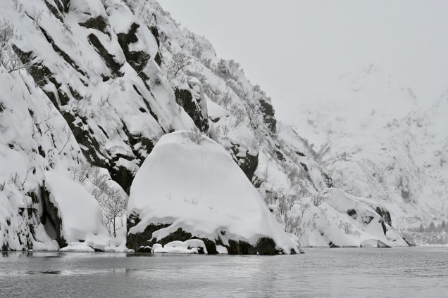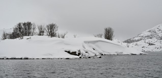 Svolvær > Ballstad ( 68.02 Nord / 13.12 ° Est ) : 85 kms . Route enneigée et eau glacée en bateau !