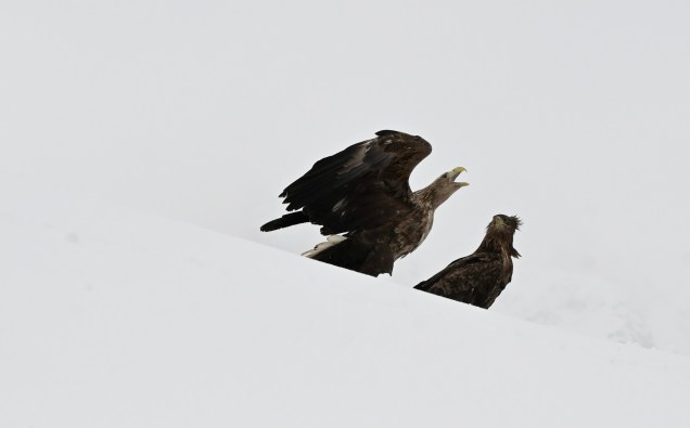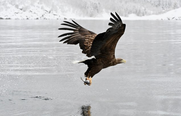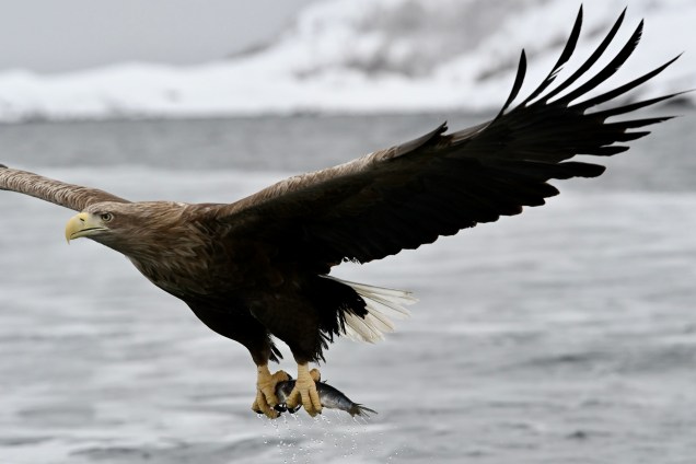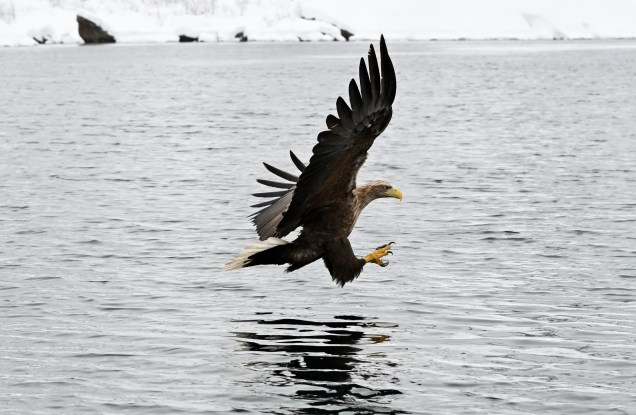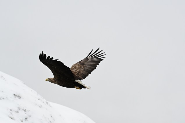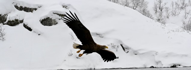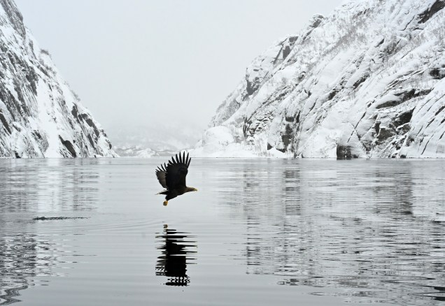 Observation des majestueux aigles de mer au programme. Ces prédateurs puissants vivent dans les îles Lofoten toute l’année. Grâce au courant du golfe qui adoucit la température, la mer ne gèle jamais et l’abondance de poisson rend ces eaux l’endroit idéal pour y vivre de façon permanente. Une envergure énorme avec plus de 2,50 m , un regard à la fois malicieux et vorace donne un spectacle vivant et impressionnant ! En plus aucune embarcation à l’horizon au vu des conditions climatiques un espace privilégié rien que pour nous !