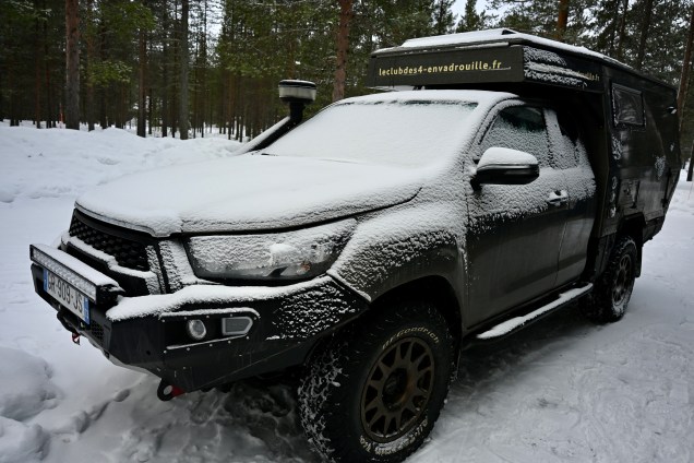 Contrôle de tous les niveaux, de toutes les liaisons élastiques, du réglage des amortisseurs qui doivent être modifié en fonction du profil des routes, vérification du comportement des clous dans les pneus… pas mal de travail cet après -midi ! Un loueur de moto-neige a été assez gentil pour mettre une petite place à notre disposition . Certes le froid commence à gagner et donc les petits doigts un peu engourdis mais au final tout s’est passé assez vite . Pierre a posé les derniers clous et donc à présent TinHux 2 tient parfaitement la route sur la glace ! Ensuite, contrôle de tous les montages électriques et hydrauliques avec recherche d’éventuelles fuites . Mention aussi sur la vérification du bon fonctionnement des chauffages et du boiler d’eau chaude . Le chauffage est une composante essentielle de cette vadrouille Nordique … nous avons même un chauffage électrique de secours mais dont on ne pourrait pas se servir à plein temps vu sa consommation ! Pour l’intérieur de la cellule, Pierre a noté une petite faiblesse des vérin , sûrement dû à la température qui baisse de plus en plus …
