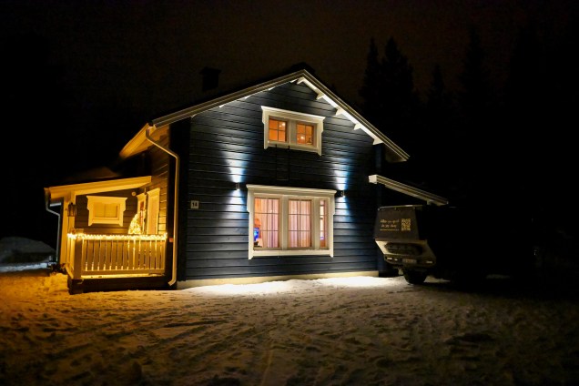 Ça fait du bien de voir un peu le soleil ! Ça y est tout est branché et l’éclairage arrière fonctionne ! Non, pas de panne, juste de la maintenance ! TinHux 2 a encore de la route à faire ! Surtout dans un tel décor ! Avec les clous, c’est presque comme sur le sac, ça accroche ! Un décor dont on ne se lasse pas ! Si à 50 ans , on a pas une Audi.. c’est qu’on a raté sa vie !!!Nous on s’en fout… à plus de 60 ans pour Pierre, on a un parking spécial TinHux ! Ambiance montagne à Sirkka Même la nuit les pistes sont open ! Là pas d’économie d’énergie ! Un sacré contraste avec nos villes qui sont éteinte la nuit ! Pierre a tenté l’aurore boréale, maigre résultat même si le ciel était joli ce soir tard … Le temps n’est pas assez clair et cela depuis que nous avons commencé l’aventure … snif !