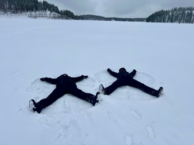 Après un bon petit déjeuner, nous sommes partis pour une journée light, en se mettant gentiment en train pour cette semaine ! Au programme, découverte du lac gelé de Levi . Pensez donc que dans certains endroit en Finlande il y a plus de lacs que d’habitants ! Faire même seulement une promenade sur un lac tout glacé et enneigé est une expérience étonnante et vivifiante ! Leïla et Momo avançait à pas prudents … pensez donc , il y a plus d’un mètre de glace dessous ! Les lacs ici gèlent de Octobre à Décembre de quoi faire une bonne calotte de glace … aucun risque !