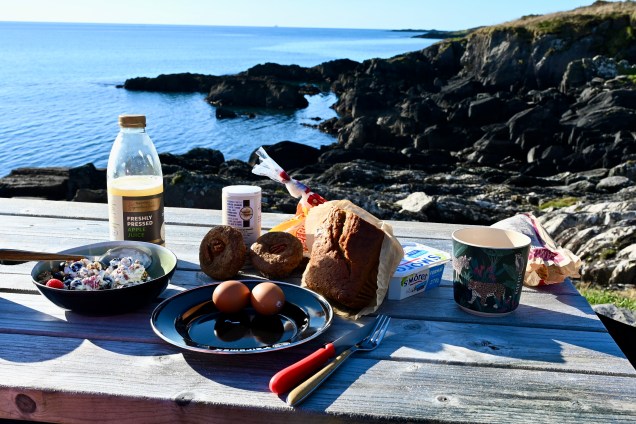 Un p’tit dej de luxe avec une vue imprenable sur l’océan avec en toile de fond le Fasnet ! Seul contre le reste du monde avec ses 54 m de granit érigés sur une minuscule île rocailleuse ce phare est une légende . Si vous le cherchez sur une carte, vous ne trouverez qu’un point entouré de bleu. L’image est marquante car sous les flots se cache un monde hostile. Des récifs abrupts qui ont fait plier bon nombre de navires par le passé. C’est un phare mythique et aussi un symbole de la course au large à la voile avec une course mondiale où les marins passe cette marque de parcours. Pierre a eu la chance de vivre ce moment lors de sa qualification pour la transat Jacques Vabre ! Un chouette clin d’œil pour lui de voir ce souvenir côté terre !