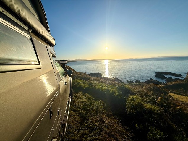 Imaginez en premier l’ouverture au petit matin de la porte de notre maison à roulettes … si, si même si les oiseaux de mauvaise augure nous disait qu’il pleut tout le temps en Irlande, le soleil était présent de la plus belle manière ! Et toc , pas une goutte de pluie depuis que nous sommes arrivés ici !